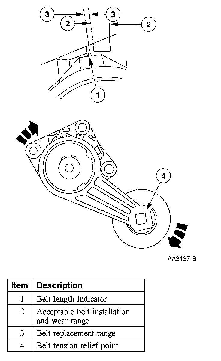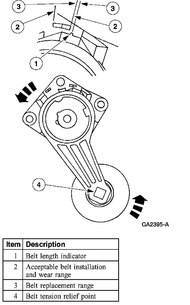 The drive belt is too long. A drive belt that is too long will allow the drive belt tensioner arm to go all the way to the arm travel stop under certain load conditions, which will release tension to the drive belt. If the drive belt tensioner indicator is outside of the wear range window, install a new drive belt.