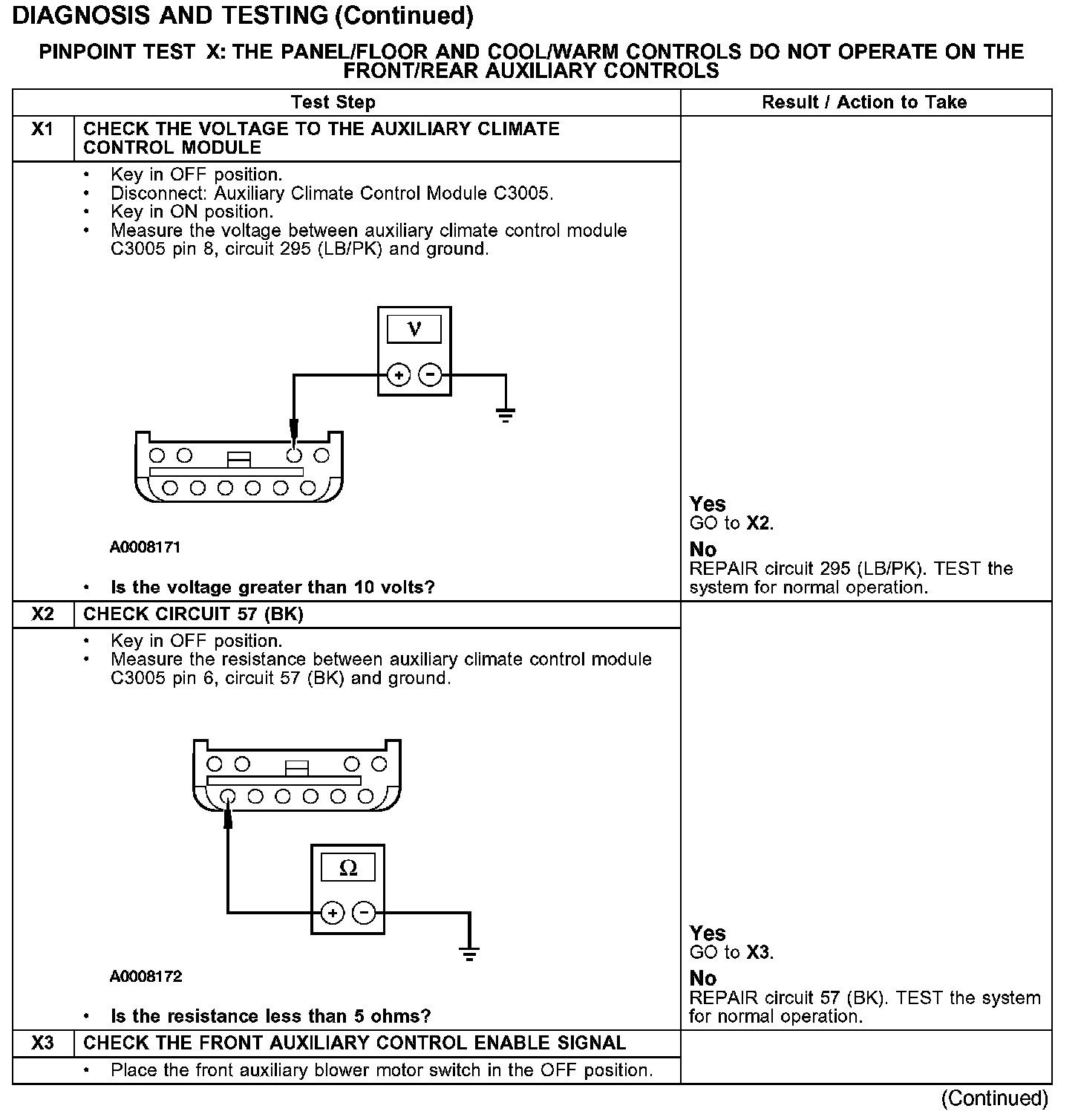 PINPOINT TEST X: THE PANEL/FLOOR AND COOL/WARM CONTROLS DO NOT OPERATE ON THE FRONT/REAR AUXILIARY CONTROLS