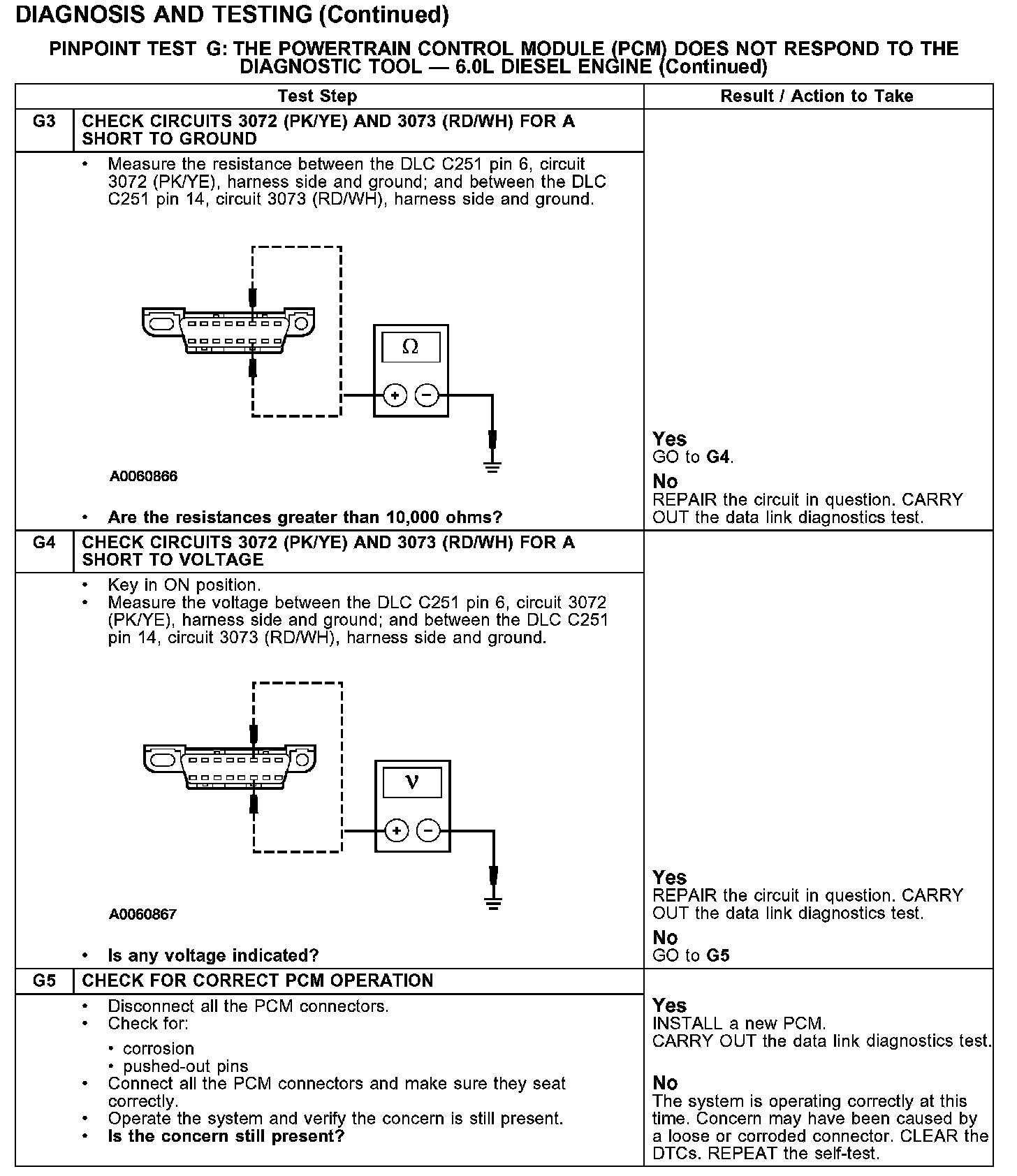 PINPOINT TEST G: THE POWERTRAIN CONTROL MODULE (PCM) DOES NOT RESPOND TO THE DIAGNOSTIC TOOL - 6.0L DIESEL ENGINE