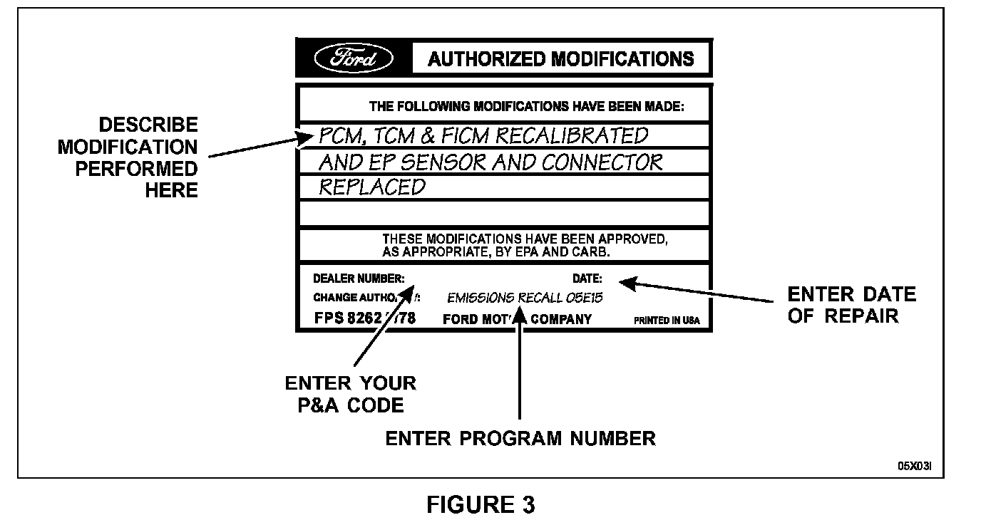 The 2004 model year program involves replacing the exhaust pressure (EP) sensor and connector and recalibrating the powertrain control module (PCM), transmission control module (1CM) and the fuel injection control module (FICM) with the latest software.