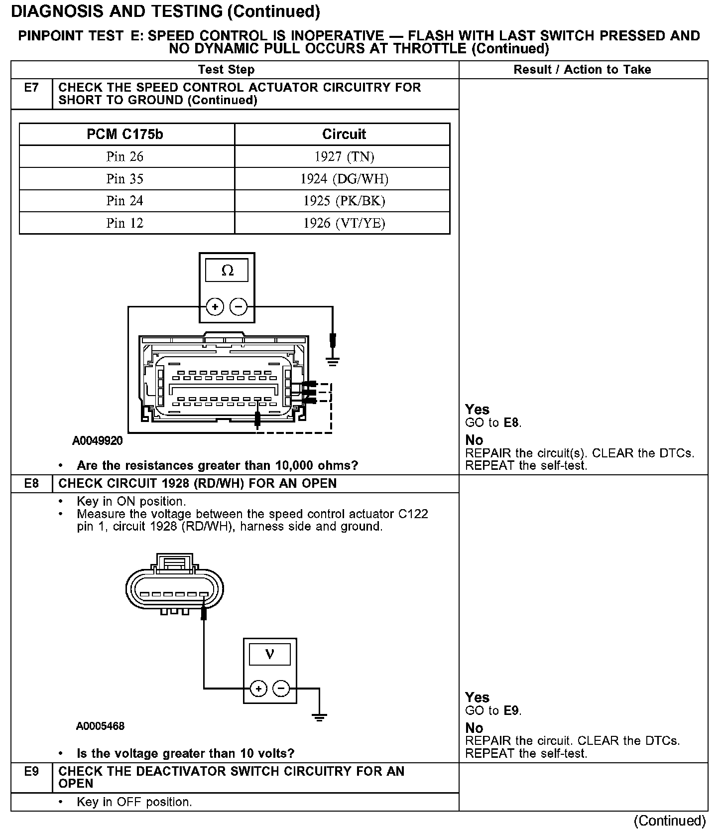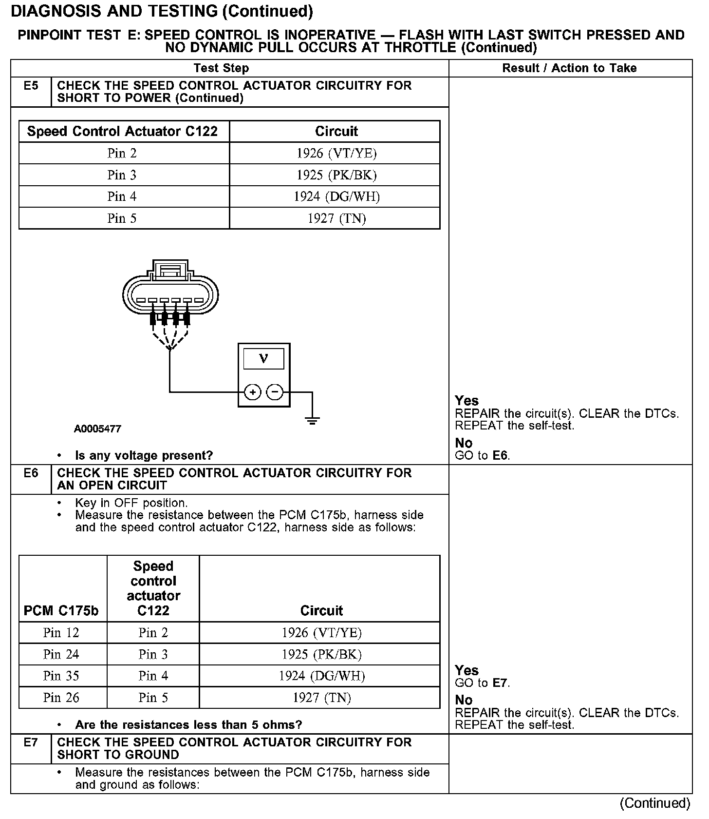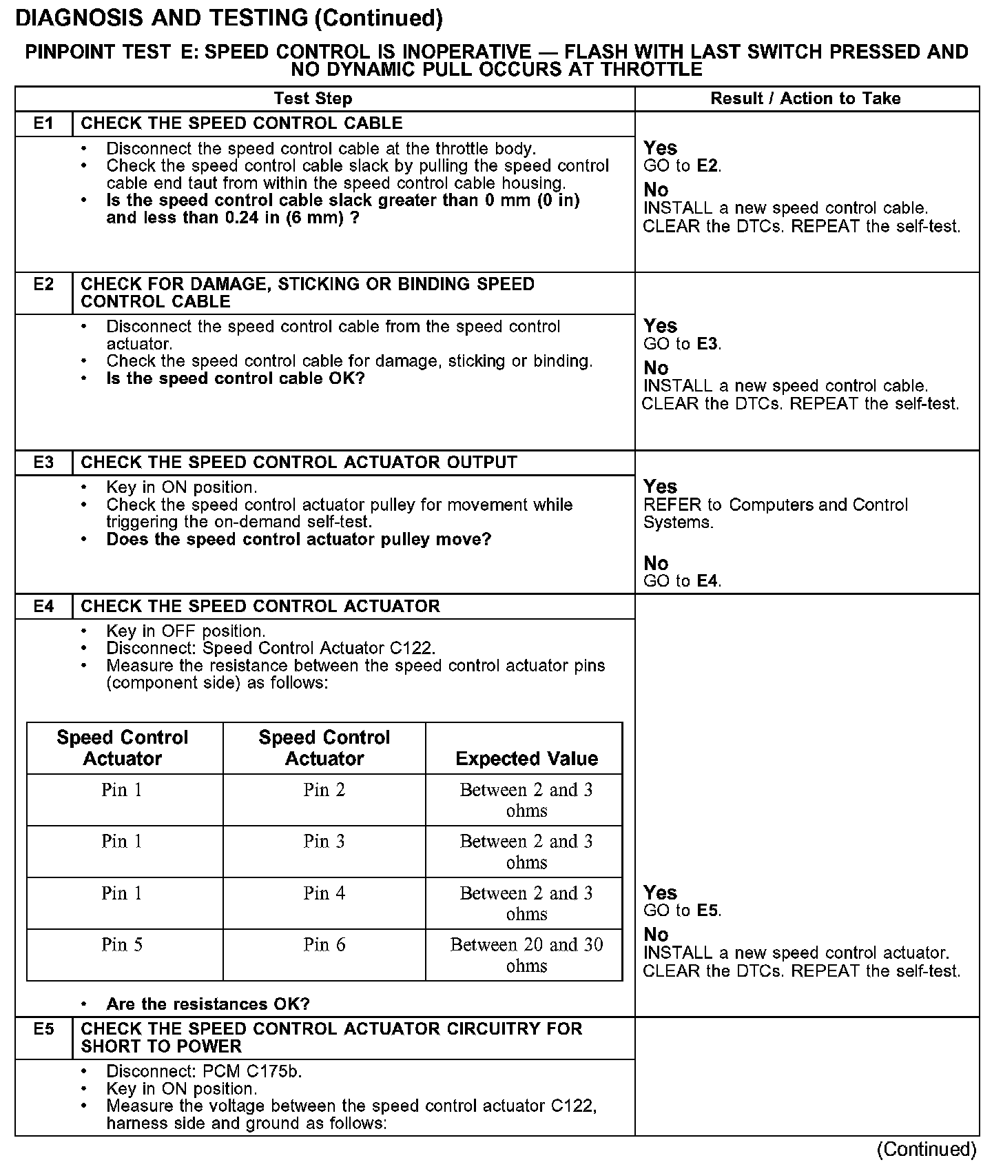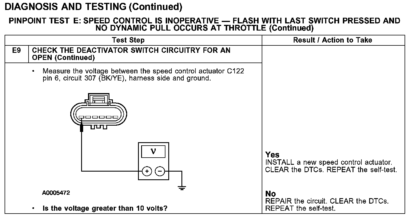 PINPOINT TEST E: SPEED CONTROL IS INOPERATIVE - FLASH WITH LAST SWITCH PRESSED AND NO DYNAMIC PULL OCCURS AT THROTTLE
