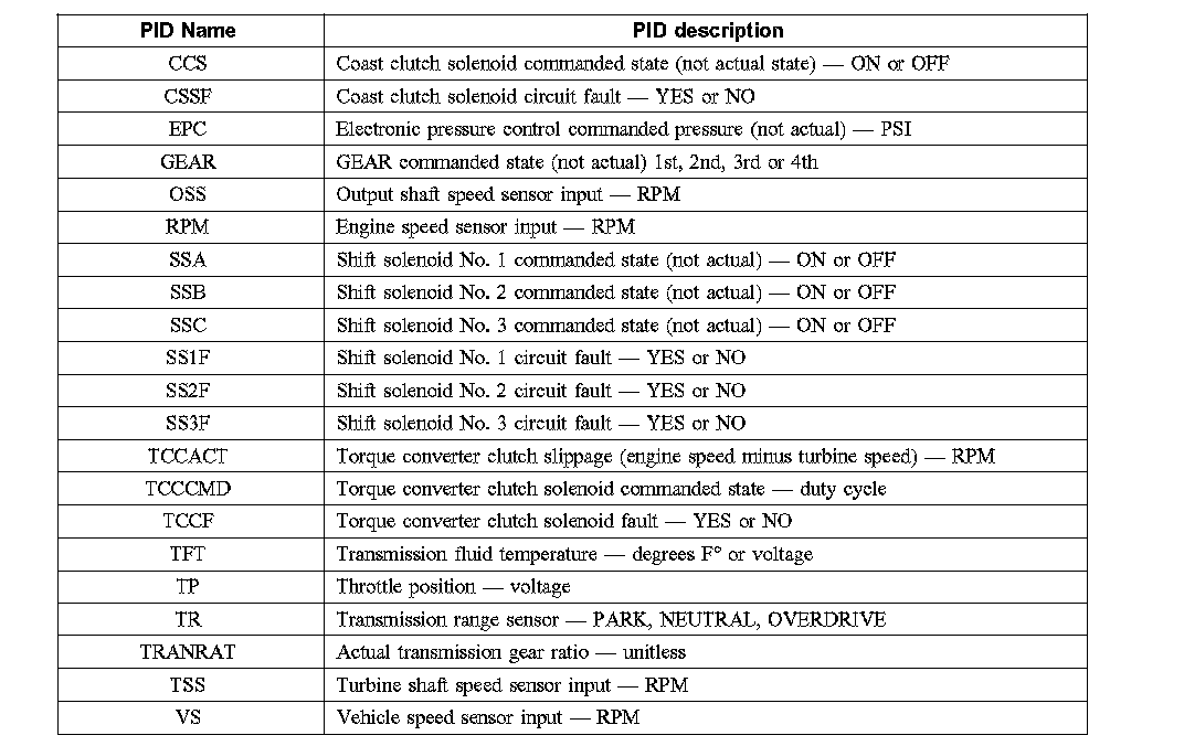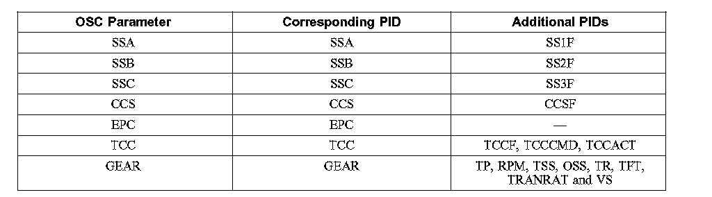 To confirm that the OSC value was sent by the Scan Tool and the Powertrain Control Module (PCM) has accepted the OSC substitution, a corresponding PID for each OSC parameter must be monitored. After sending the OSC value the corresponding PID value should equal the OSC value. Additional PIDs should be monitored to help the technician adequately diagnose the transmission. The following is a list of PIDs to monitor while using OSC.