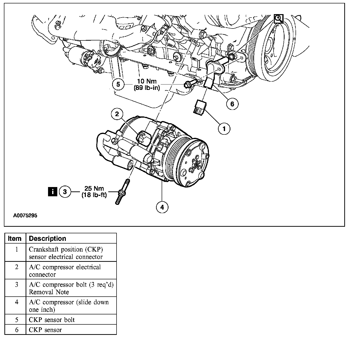 1. It is not necessary to remove the A/C compressor bolts. Loosen the bolts enough to slide the compressor down one inch, allowing access for crankshaft position (CKP) sensor removal.