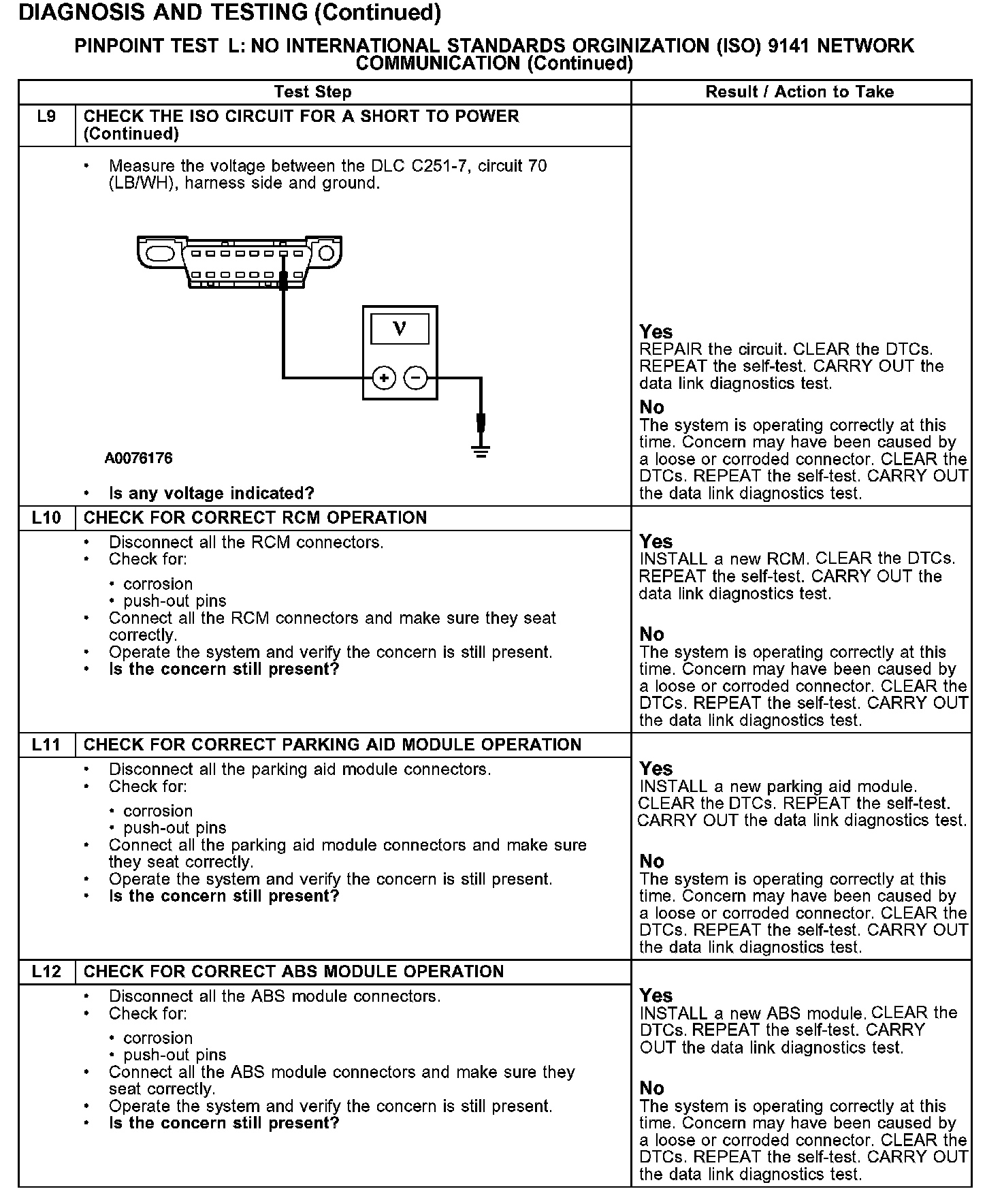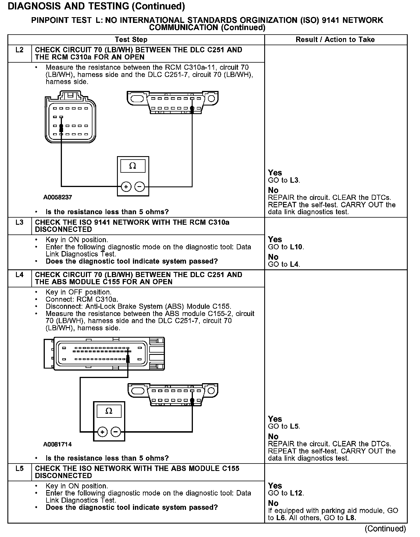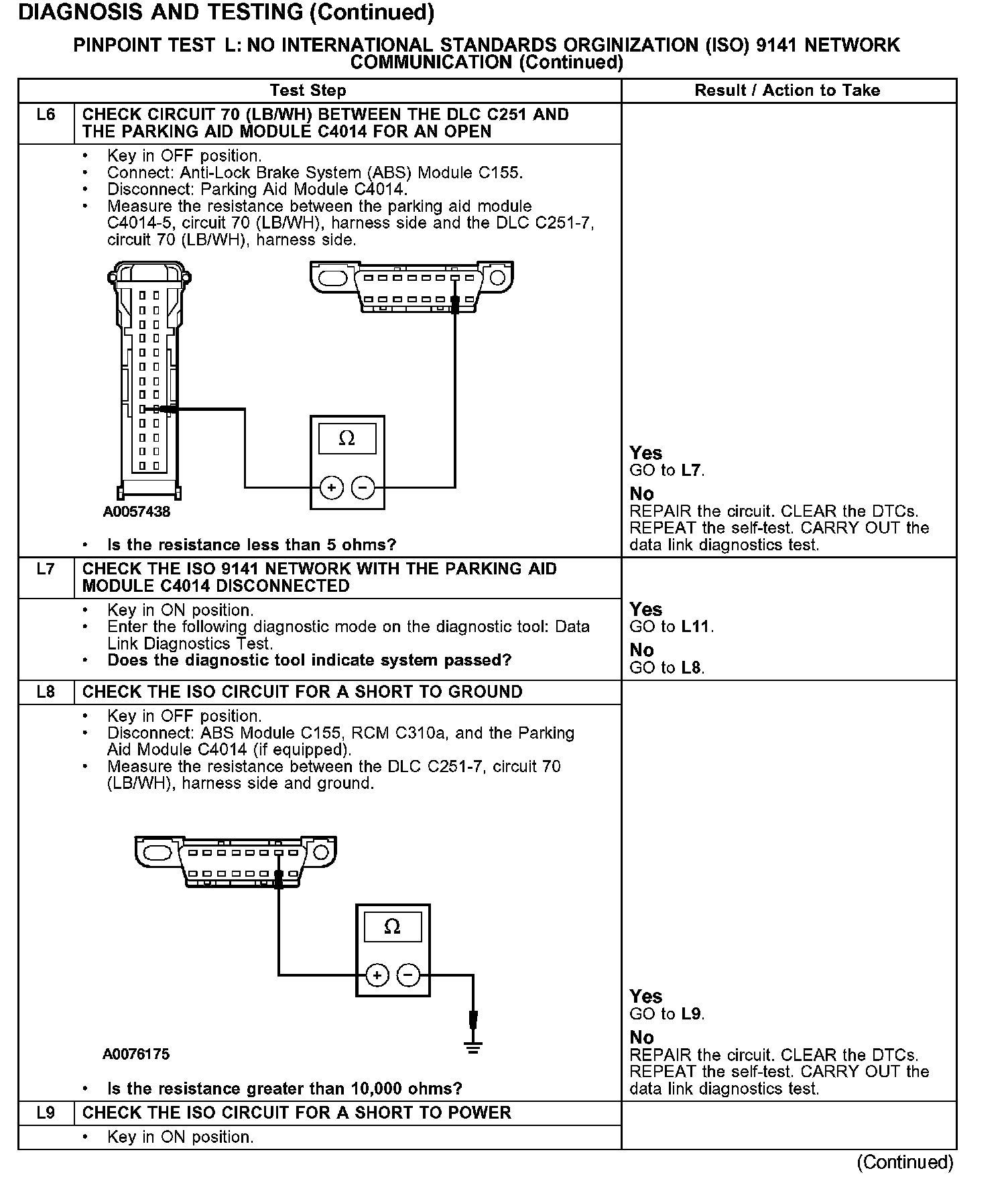 The parking aid module and the restraint control module (RCM) communicate with the diagnostic tool through the ISO 9141 communications network circuit 70 (LB/WH). The ABS module is also on the ISO network, but does not utilize this network for communication with the diagnostic tool. If circuit 70 (LB/WH) becomes open or shorted to ground, communications to that module will not be possible. Check circuit 70 (LB/WH) between the parking aid module, RCM, ABS module, and the DLC C251. Total resistance values must not be more than 5 ohms. If the resistance is more than 5 ohms there is an open in circuit 70 (LB/WH), damage to the DLC C251, damage to the parking aid module, RCM, ABS module, or a problem in one of the in-line connectors. If, after individual checks of each circuit leading to a module show resistance values less than 5 ohms and no in-line connector issues present, the data link diagnostics test must be run with the module in question disconnected. If the data links diagnostics test passes with the module in question disconnected it is the source of the concern and should be removed and a new module installed.