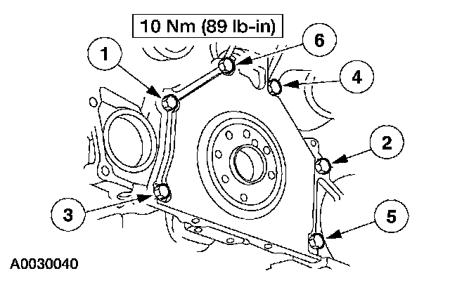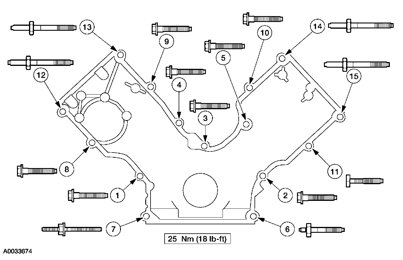 50. Tighten the front cover bolts and stud bolts in the sequence shown.