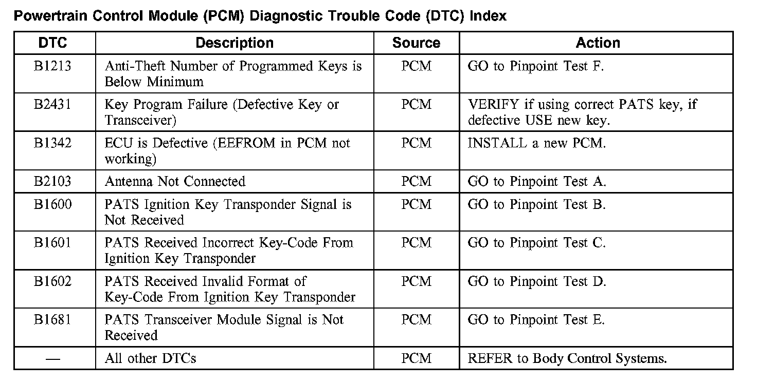 Powertrain Control Module DTC Index