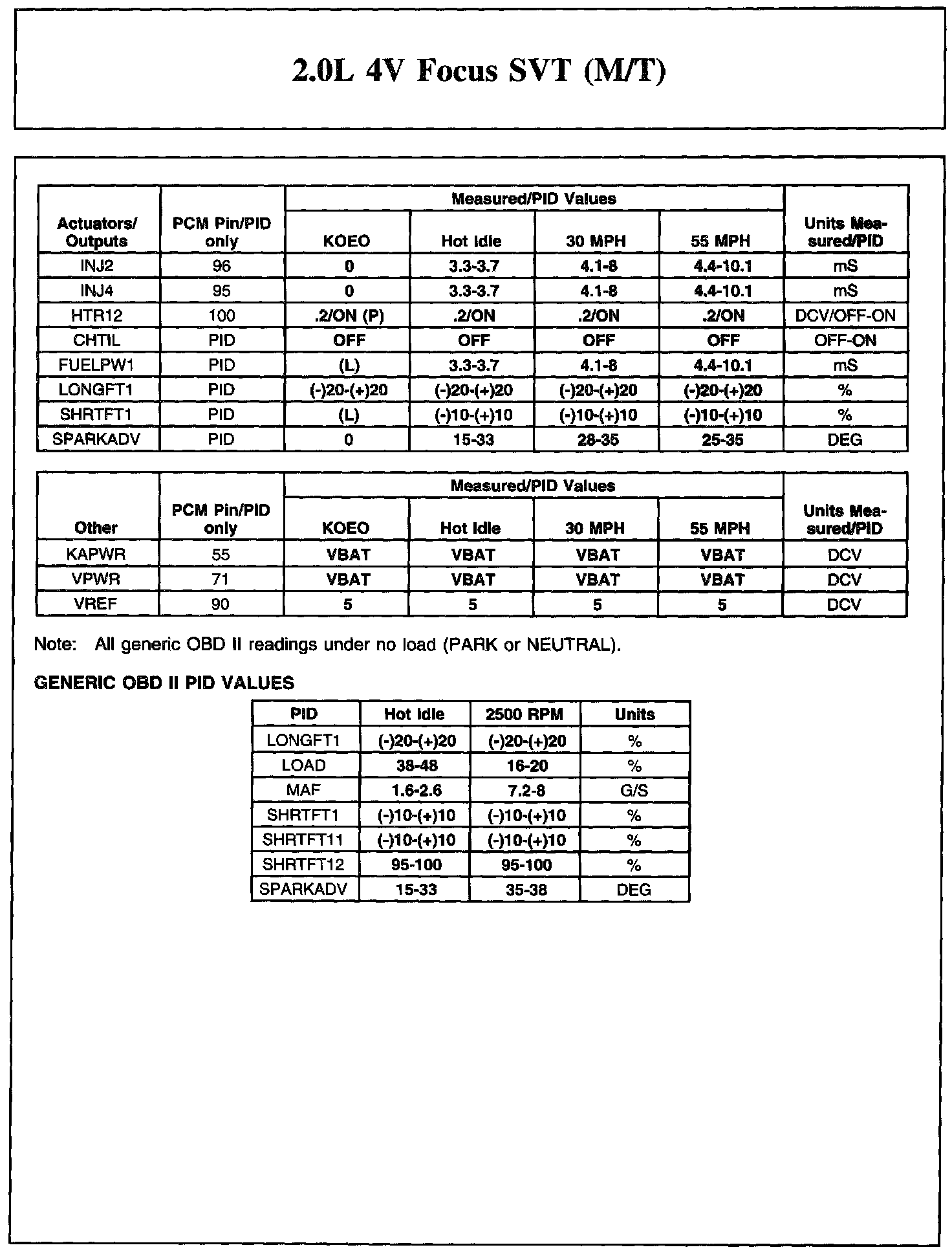 The Typical Diagnostic Reference Value Charts do not display fault PIDs. These are PIDs which indicate a hard fault with the circuit. They display a value of "YES" or "NO" and are PIDs ending with an "F".