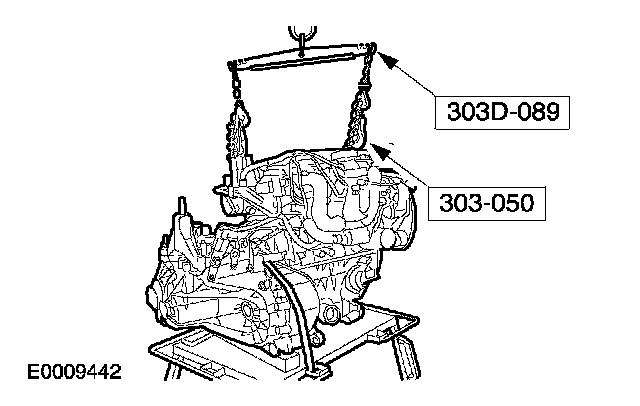 14. Remove the retaining strap from the engine and transmission assembly, and remove the assembly stand.