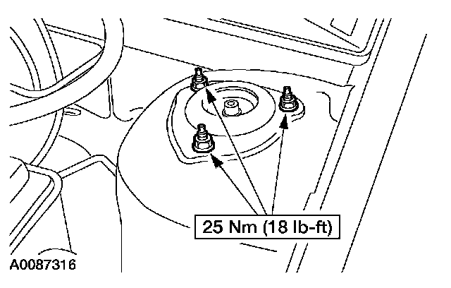 54. Tighten the strut and spring assembly upper mounting retaining nuts.