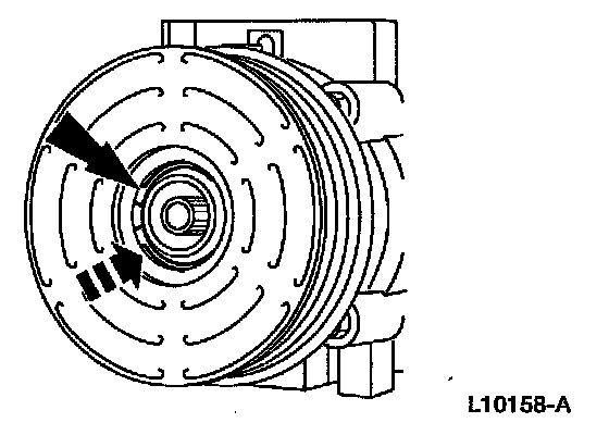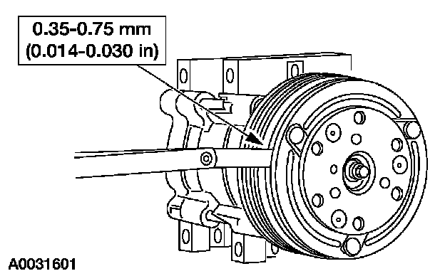 8. Measure and adjust the clutch air gap by removing or adding the A/C clutch disc and hub spacers.