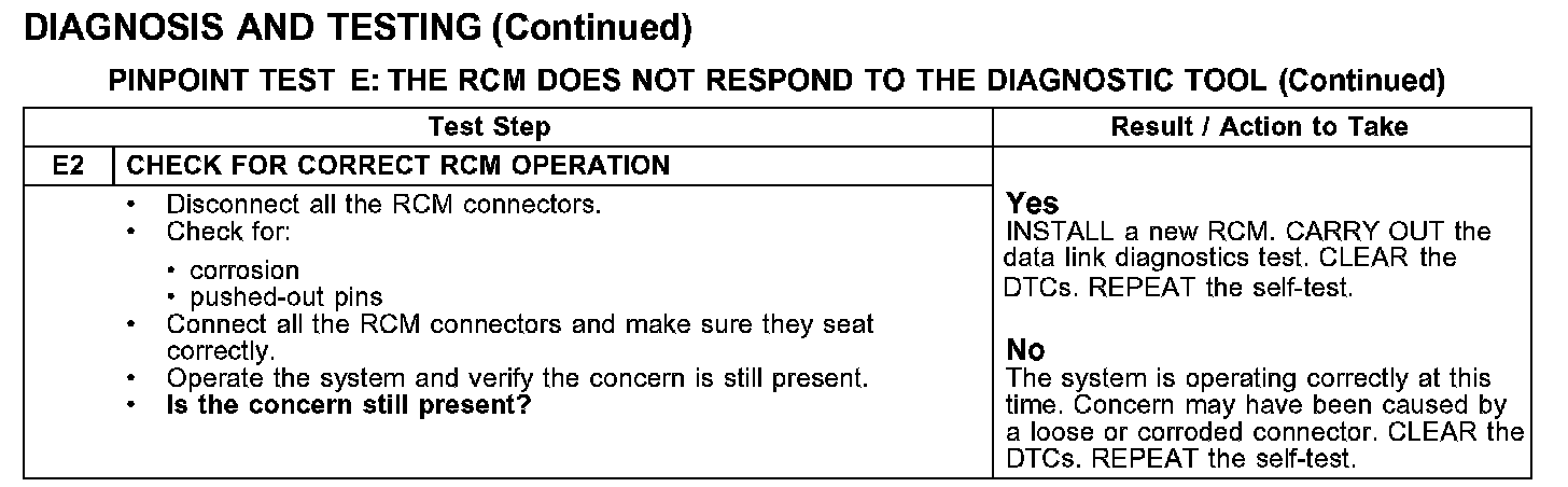 PINPOINT TEST E: THE RCM DOES NOT RESPOND TO THE DIAGNOSTIC TOOL