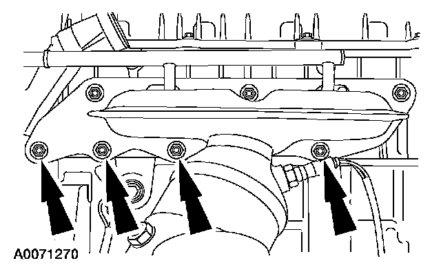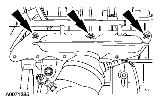 15. Remove the upper three catalytic converter nuts and studs. Discard the nuts.
