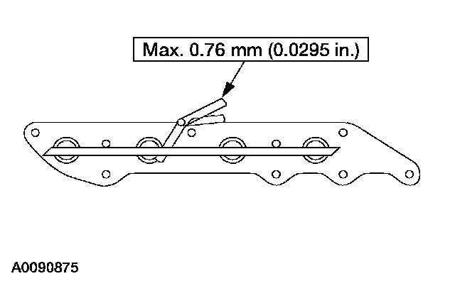 ^ Using a straightedge and a feeler gauge, place the straightedge across the catalytic converter flange surface and check for warping with the feeler gauge. If the reading is greater than the maximum specification, install a new catalytic converter, gasket and nuts.