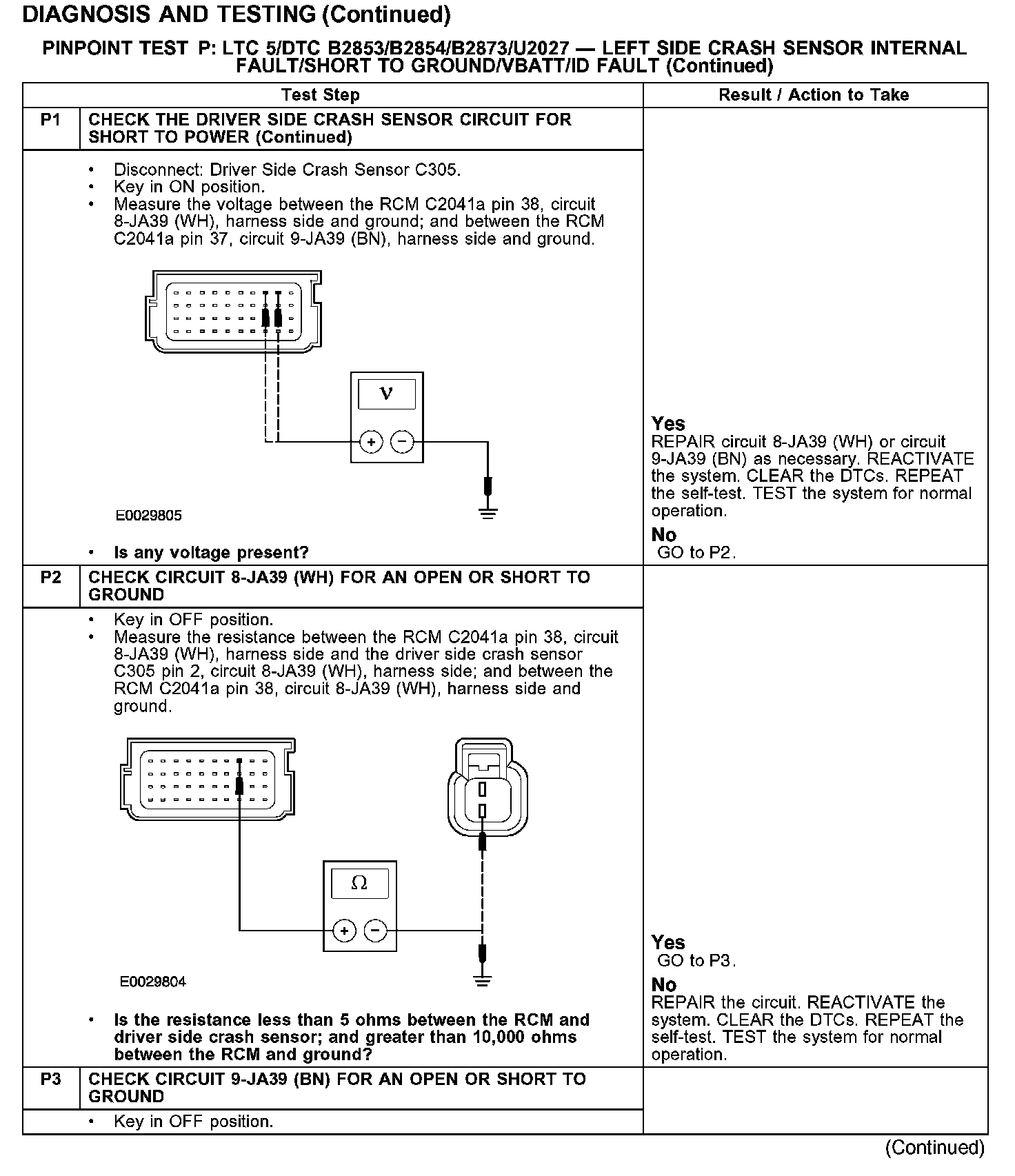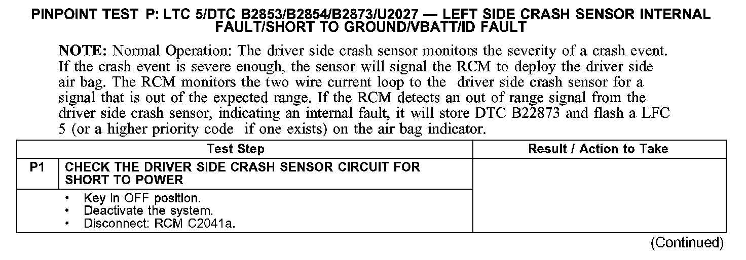 PINPOINT TEST P: LTC 5/DTC B2853/B2854/B2873/U2027 - LEFT SIDE CRASH SENSOR INTERNAL FAULT/SHORT TO GROUND/VBATT/ID FAULT