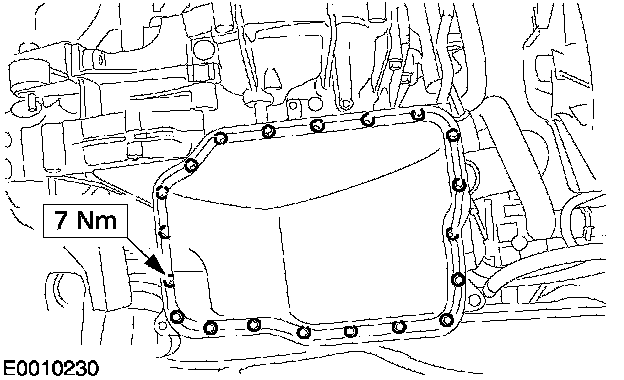 1. Apply a bead one and a half millimeters thick of Loctite 5699 or equivalent meeting Ford specification to the transaxle fluid pan.