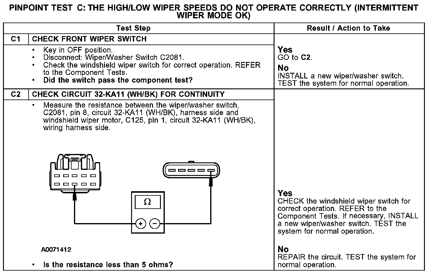 PINPOINT TEST C: THE HIGH/LOW WIPER SPEEDS DO NOT OPERATE CORRECTLY (INTERMITTENT WIPER MODE OK)