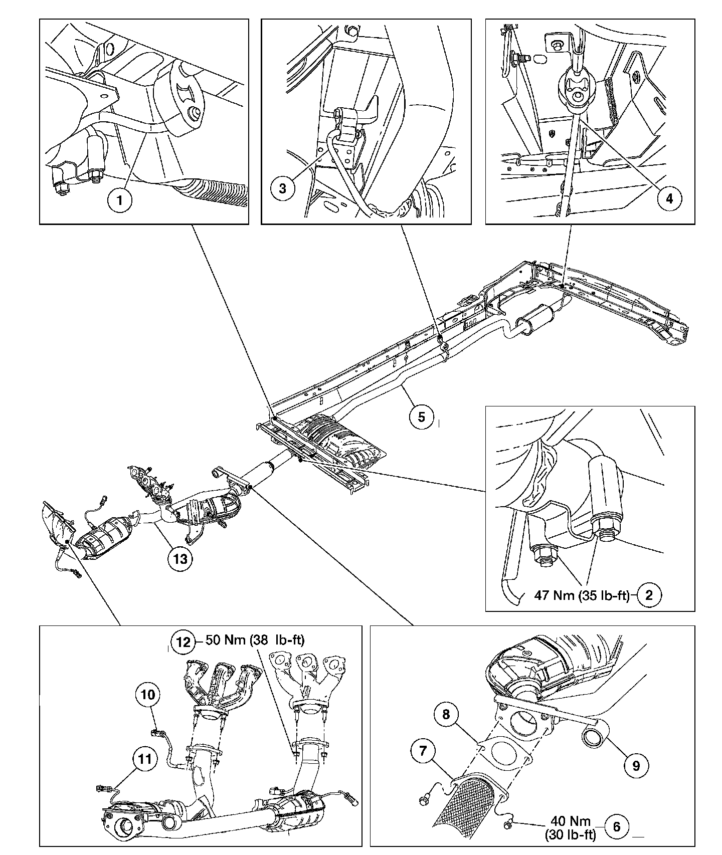 NOTE: Exhaust fasteners are of a torque prevailing design. Use only new fasteners with the same part number as the original. Torque values must be used as specified during reassembly to make sure of correct retention of exhaust components.