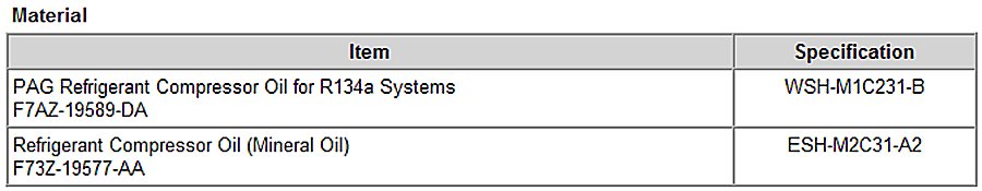 NOTICE: Refrigerant compressor oil (mineral oil) F73Z-19577-AA (Motorcraft YN-9-A) should be used to lubricate R-134a refrigerant system O-ring seals only and should not be added to the R-134a refrigerant system as an A/C compressor lubricant. PAG refrigerant compressor oil F7AZ-19D589-DA (Motorcraft YN-12-C) or equivalent meeting Ford specification WSH-M1C231-B only should be used as an A/C compressor lubricant.