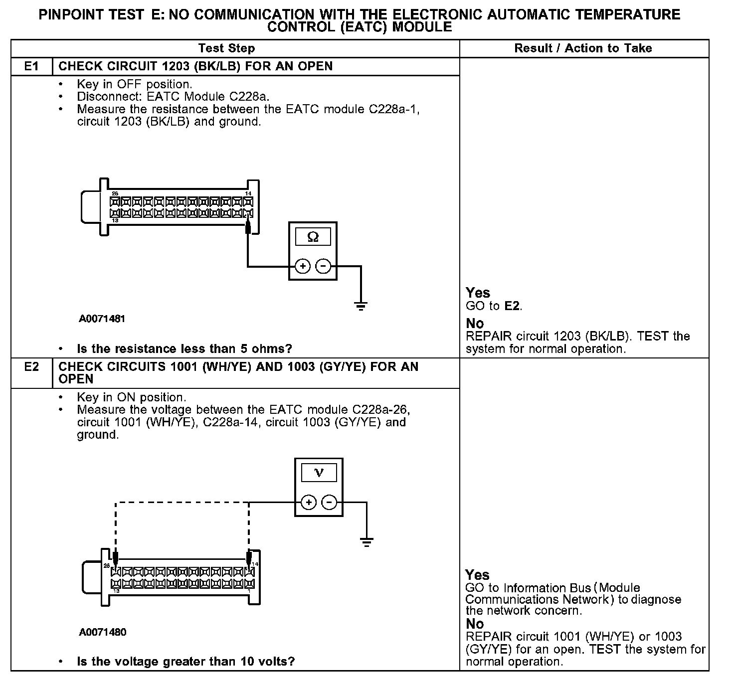 PINPOINT TEST E: NO COMMUNICATION WITH THE ELECTRONIC AUTOMATIC TEMPERATURE CONTROL (EATC) MODULETest E1-E2: