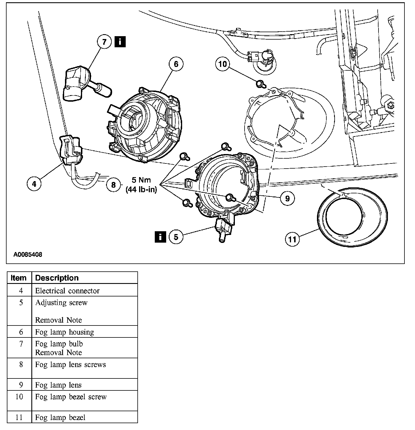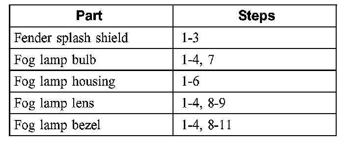 1. The fog lamp bulb should not be removed from the fog lamp until just before a new bulb is installed. Removing the bulb for an extended period of time may affect fog lamp performance. Contaminants may enter the fog lamp where they can settle on the lens and reflector. Never turn on the fog lamps with the bulb removed from the housing.