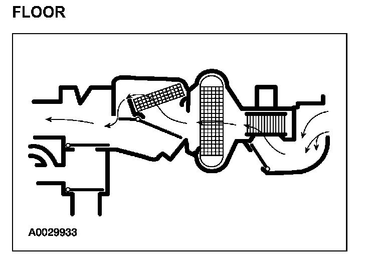 - The panel/floor door vacuum control motor is at full vacuum and the panel/defrost door vacuum control motor is at no vacuum, directing airflow to the floor duct. A small amount of airflow from the side window demisters will be present.