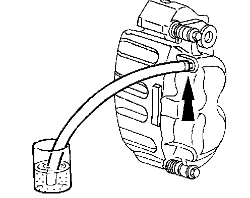 7. Place a box end wrench on the RH front disc brake caliper bleeder screw. Attach a rubber drain tube to the RH front disc brake caliper bleeder screw, and submerge the free end of the tube in a container partially filled with clean brake fluid.