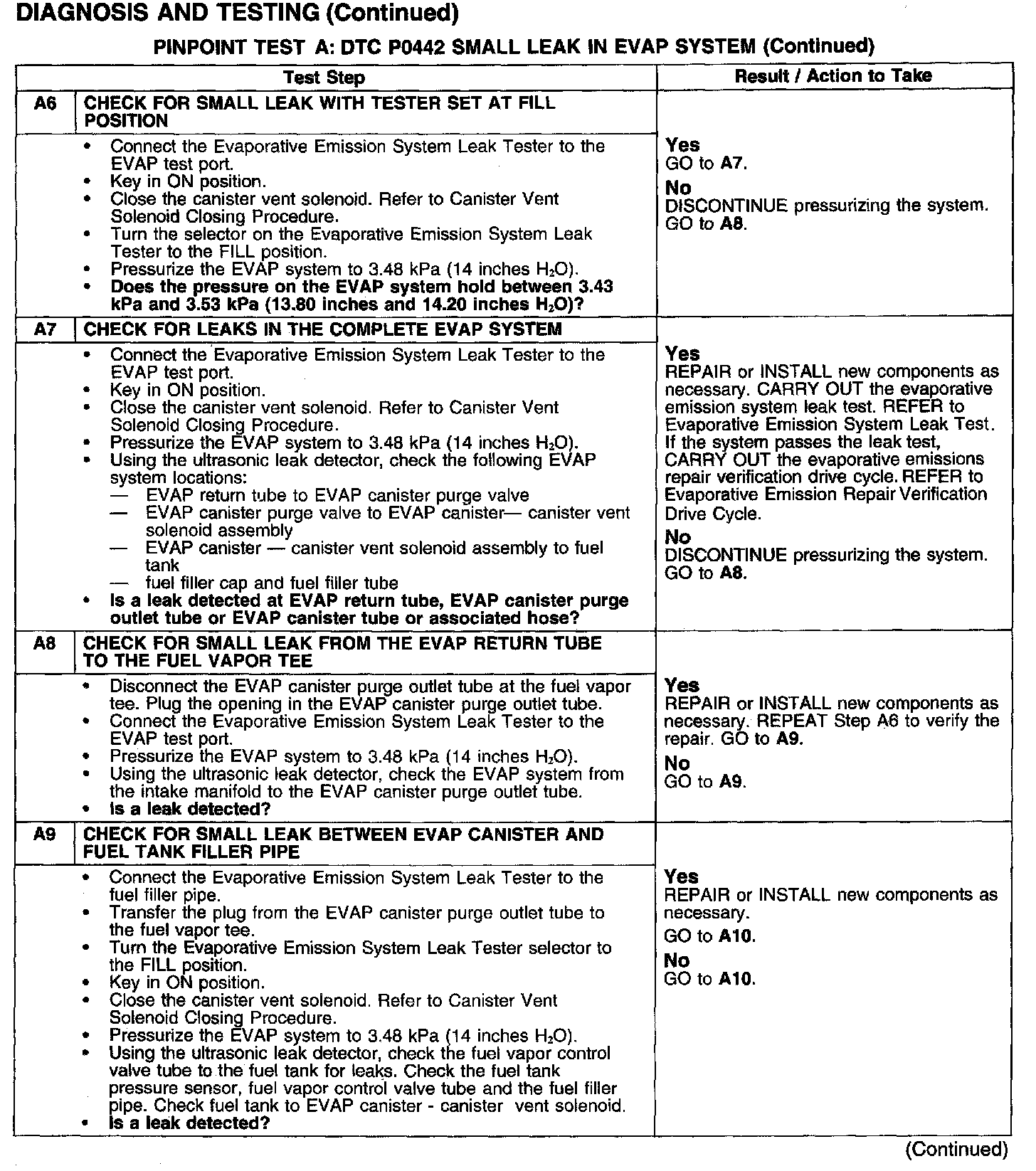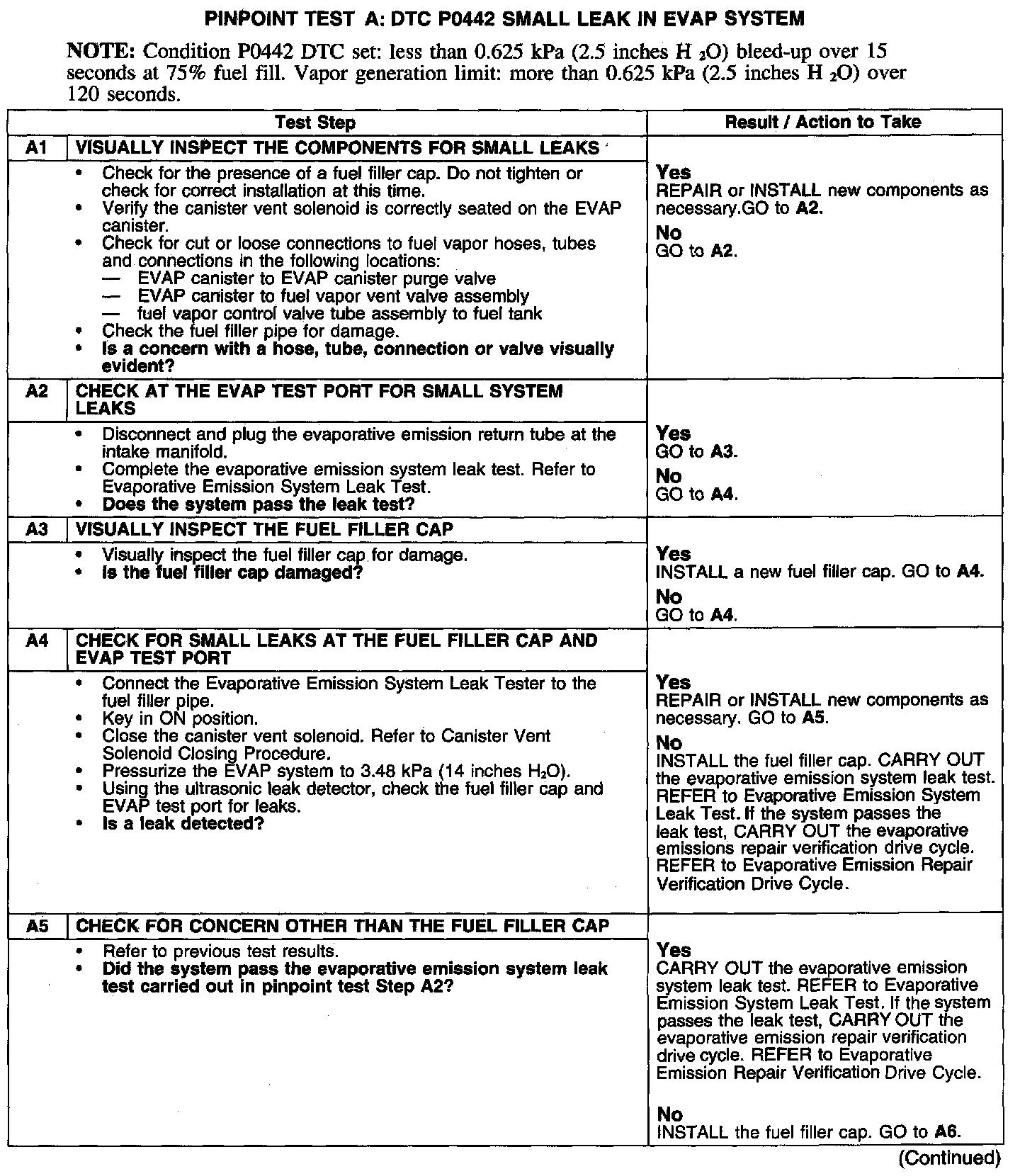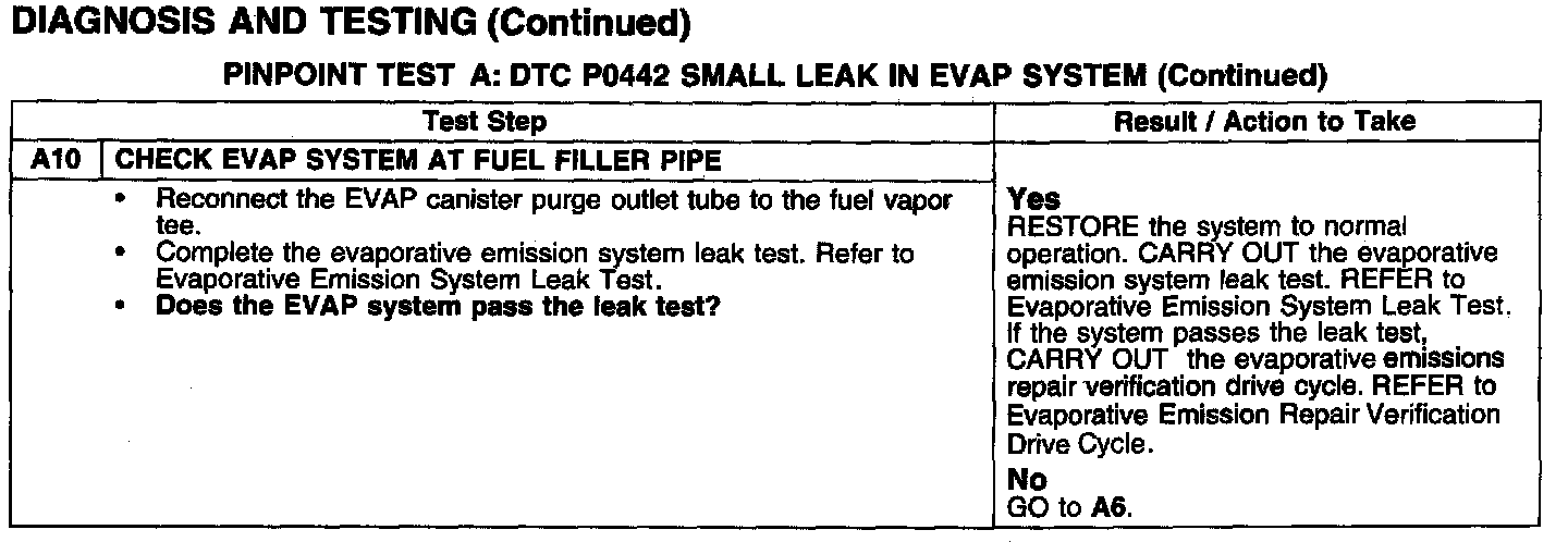 PINPOINT TEST A: DTC P0442 SMALL LEAK IN EVAP SYSTEM