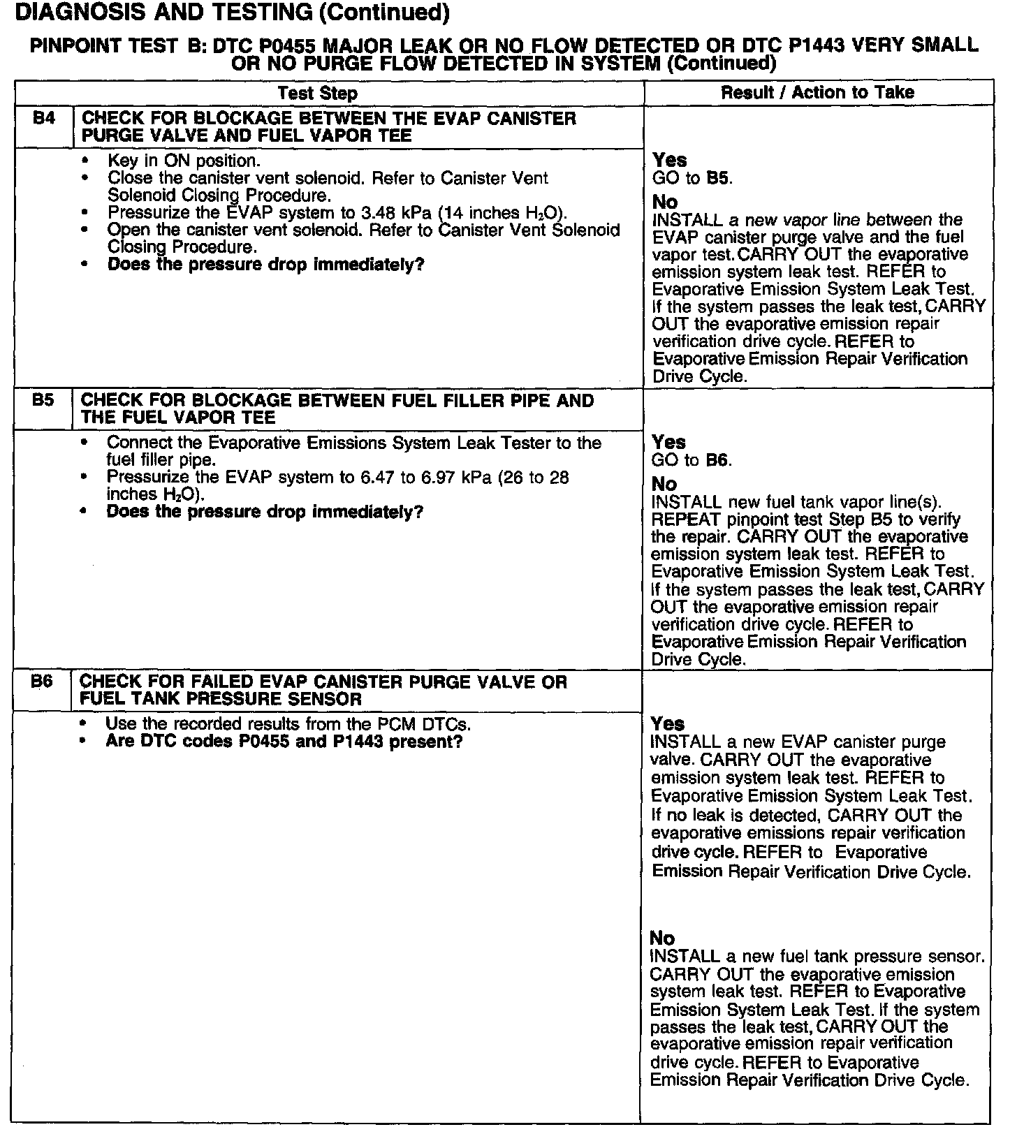 PINPOINT TEST B: DTC PO455 MAJOR LEAK OR NO FLOW DETECTED OR DTC P1443 VERY SMALL OR NO PURGE FLOW DETECTED IN SYSTEM