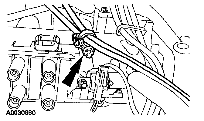 4. Disconnect the accelerator cable retaining clamp from the ignition coil stud bolt.