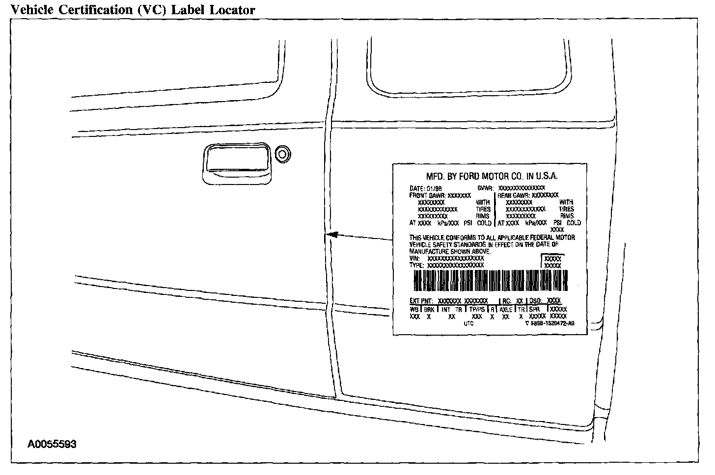The upper portion of the vehicle certification (VC) label contains the manufacturer name, the month and year of manufacture, the certification statement, and the VIN. It also includes gross vehicle weight ratings (GVWR).