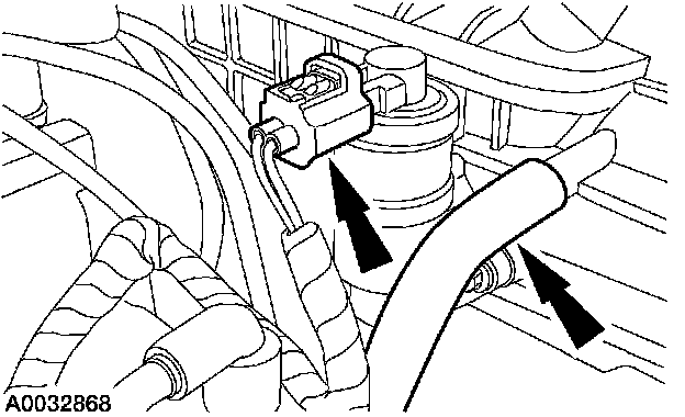 8. Disconnect the engine vacuum harness, brake booster hose, and the crankcase breather hose. Disconnect the coolant hoses.
