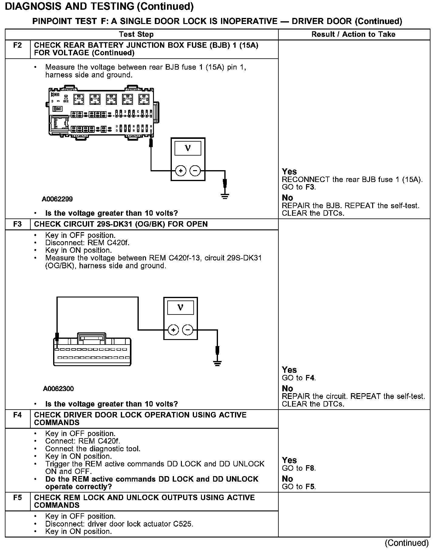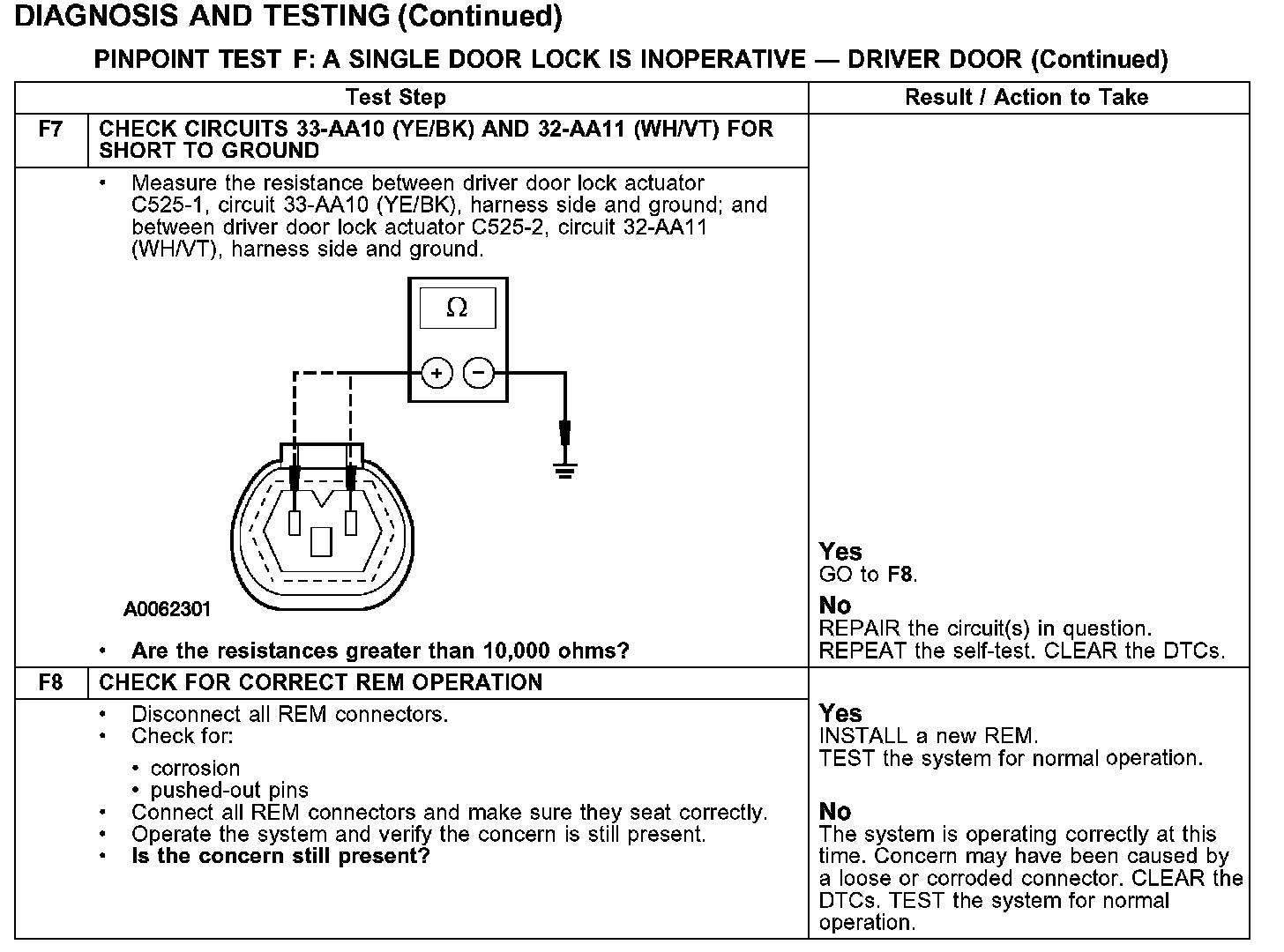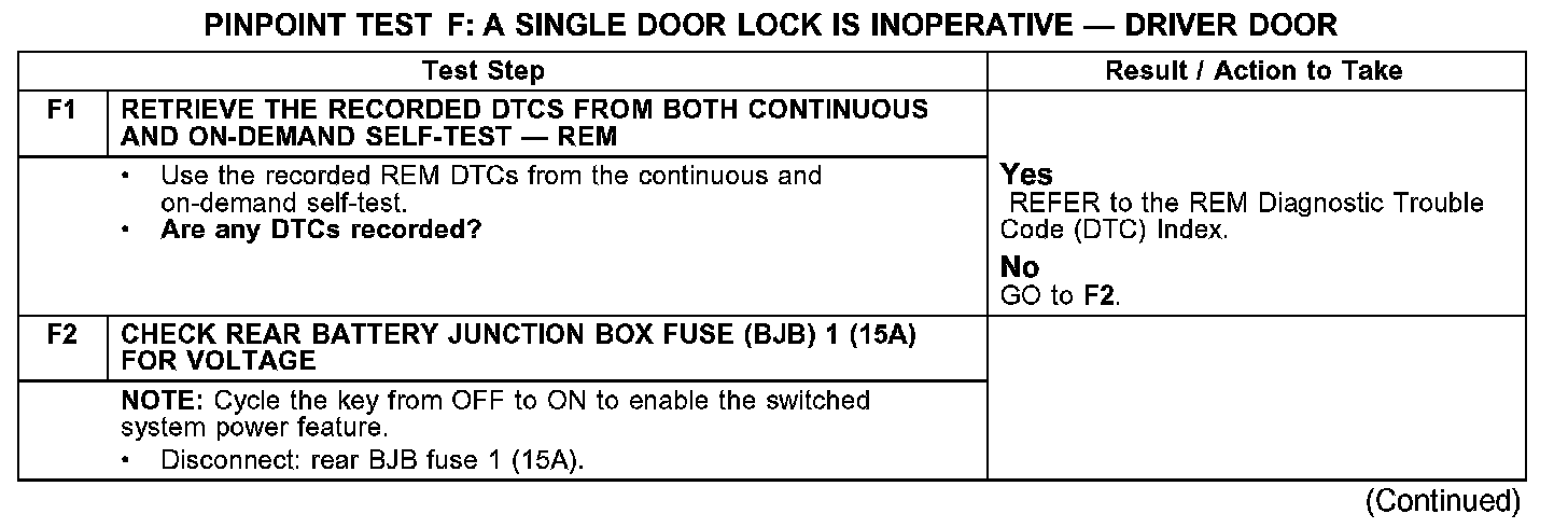 PINPOINT TEST F: A SINGLE DOOR LOCK IS INOPERATIVE - DRIVER DOORTest F1-F2: