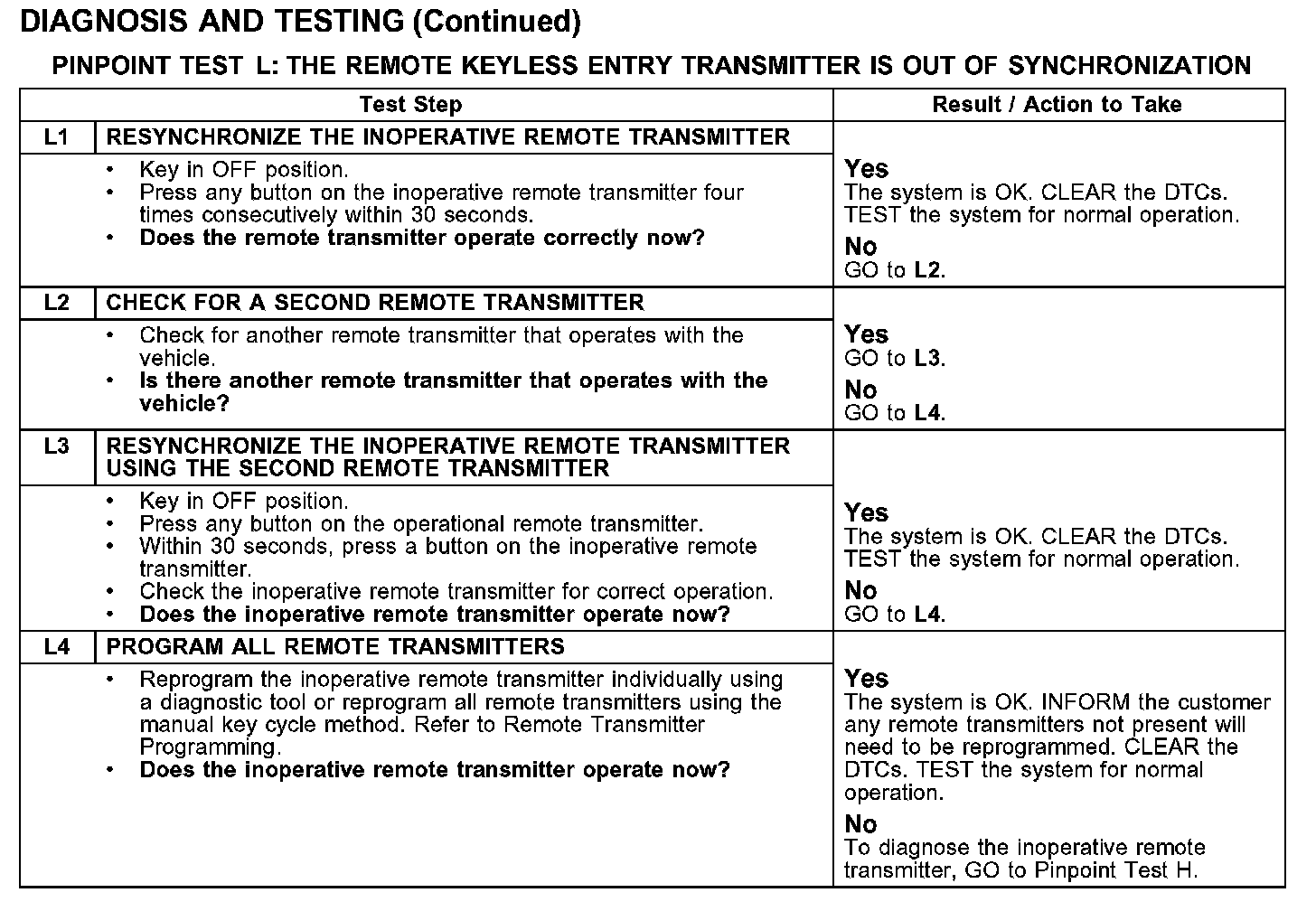 PINPOINT TEST L: THE REMOTE KEYLESS ENTRY TRANSMITTER IS OUT OF SYNCHRONIZATIONTest L1-L4: