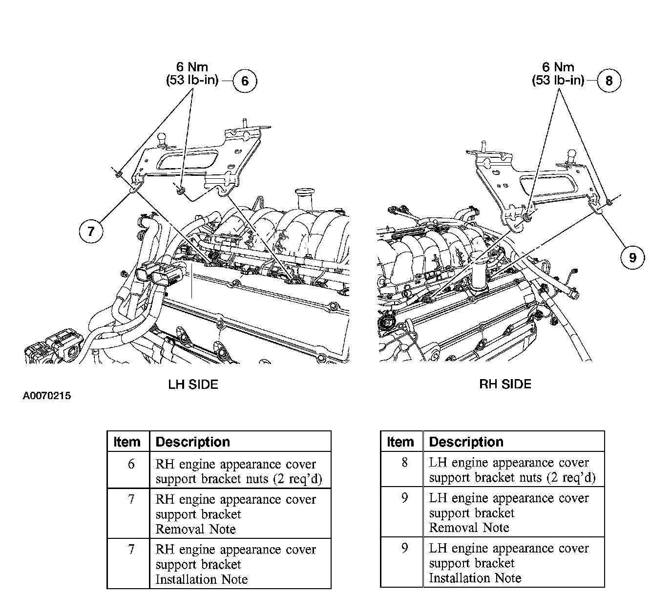 Items 7 and 9: Engine Appearance Cover Support Bracket Removal Note