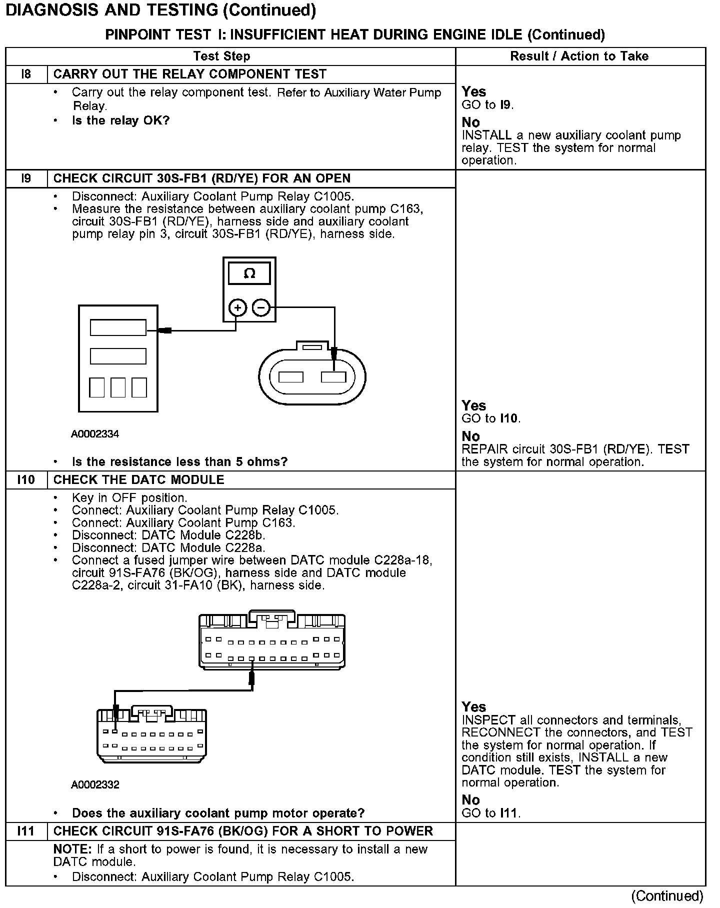 Under normal operation, the auxiliary coolant pump relay coil receives a ground from the Dual Automatic Temperature Control (DATC) module through circuit 91S-FA76 (BK/OG). The coil receives battery voltage through circuit 30-FA74 (RD/GN). Battery voltage is supplied to the relay contacts from circuit 30-FA74 (RD/GN). When the relay coil is energized, voltage is delivered to the auxiliary coolant pump motor through circuit 30S-FB1 (RD/YE). Ground for the motor is provided through circuit 31-FB1 (BK/YE).