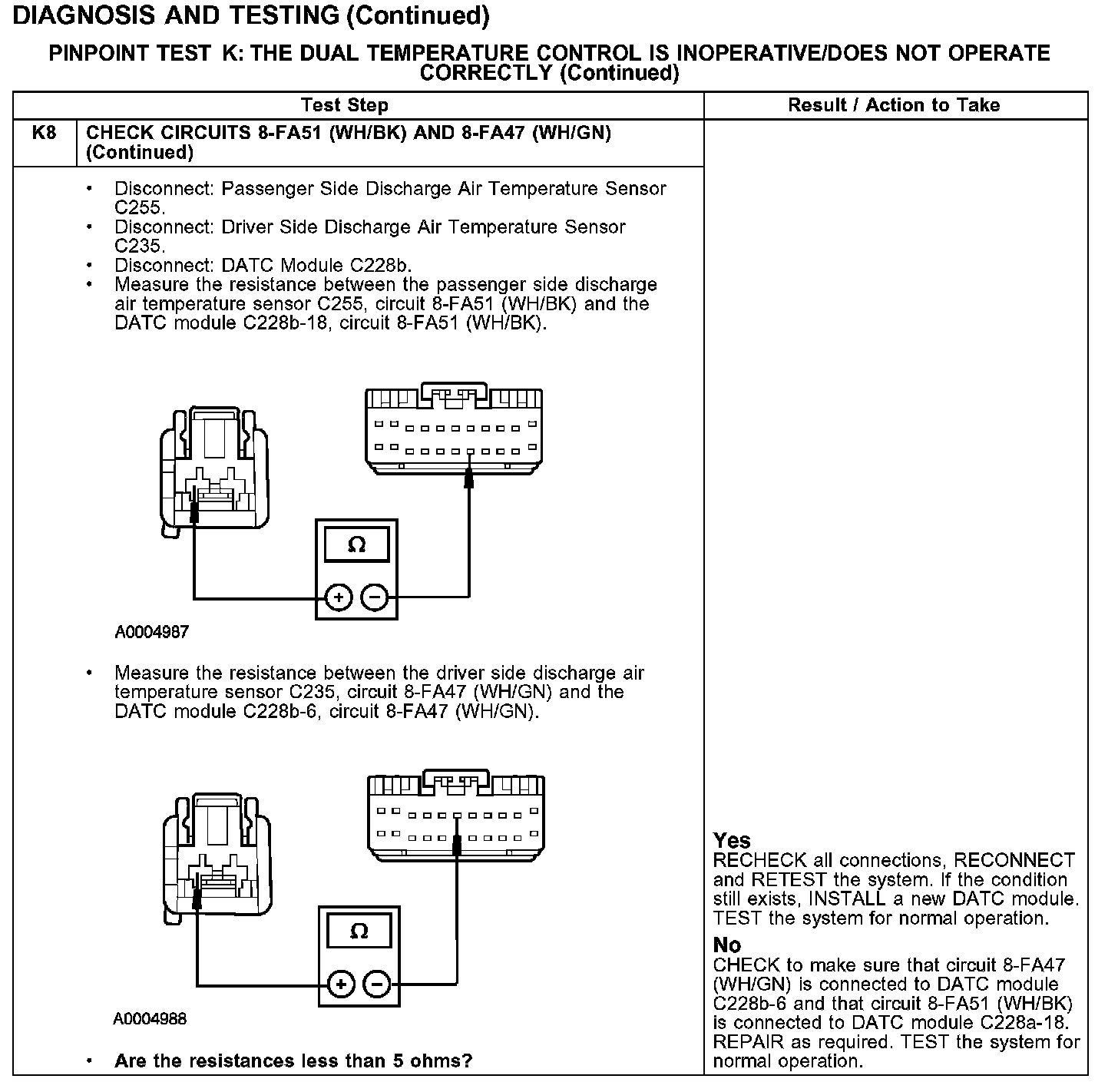 Under normal operation, the LH and RH discharge temperature sensors receive a ground from the Dual Automatic Temperature Control (DATC) module through circuit (LH) 9-FA47 (BN/GN)/9-FA3 (BN/RD) and (RH) 9-FA51 (BN/YE)/9-FA3 (BN/RD). A 5-volt reference voltage is supplied to the LH and RH discharge temperature sensors from the DATC module through circuits (LH) 8-FA47 (WH/GN) and (RH) 8-FA51 (WH/BK).