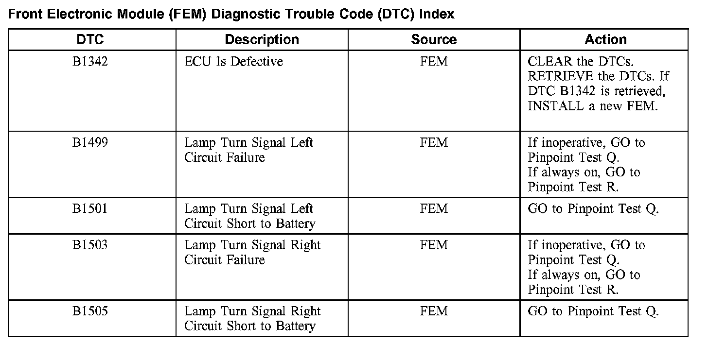 Front Electronic Module (FEM) Diagnostic Trouble Code (DTC) Index