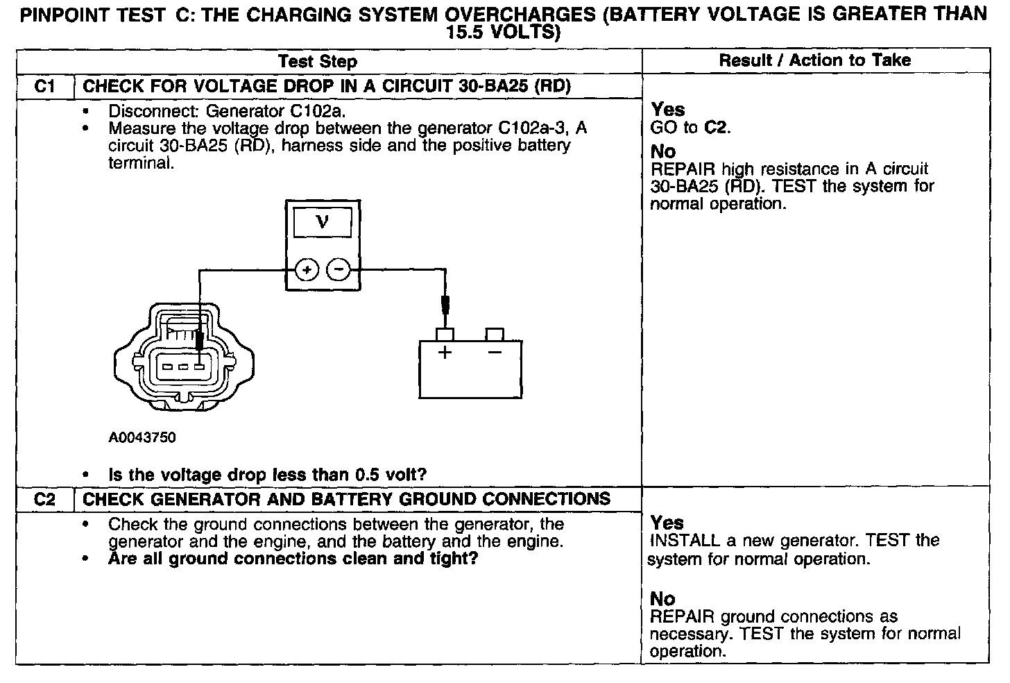 PINPOINT TEST C: THE CHARGING SYSTEM OVERCHARGES (BATTERY VOLTAGE IS GREATER THAN 15.5 VOLTS)Test C1-C2: