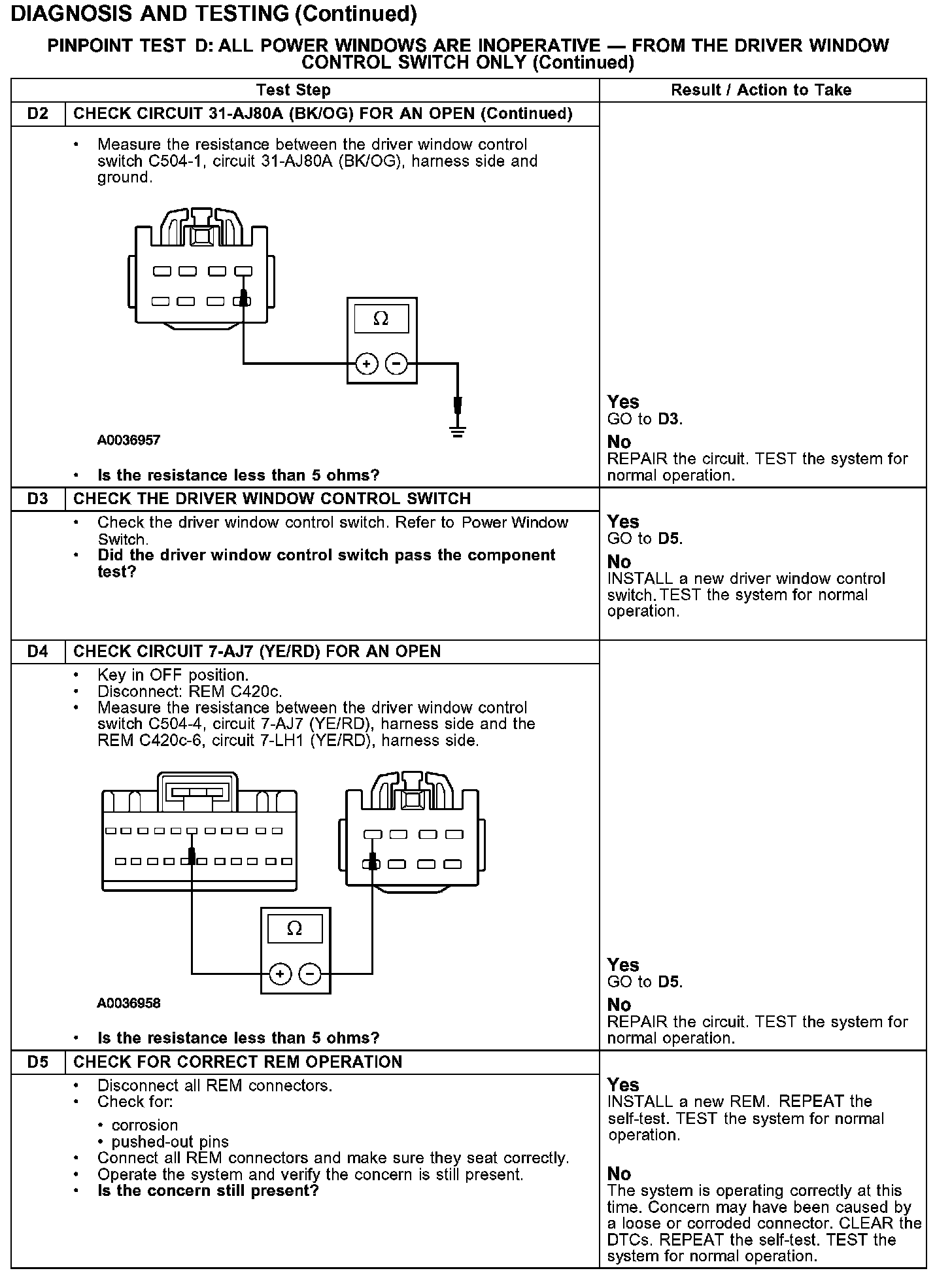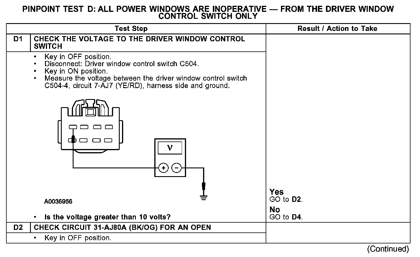 PINPOINT TEST D: ALL POWER WINDOWS ARE INOPERATIVE - FROM THE DRIVER WINDOW CONTROL SWITCH ONLYTest D1-D2: