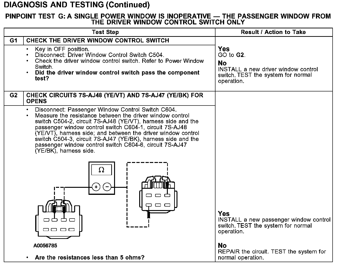 PINPOINT TEST G: A SINGLE POWER WINDOW IS INOPERATIVE - THE PASSENGER WINDOW FROM THE DRIVER WINDOW CONTROL SWITCH ONLYTest G1-G2: