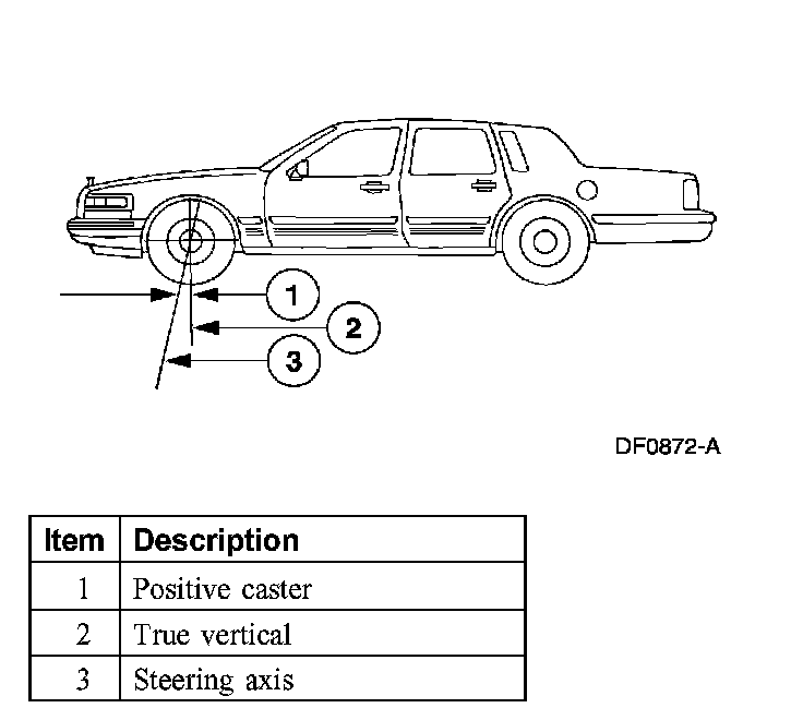 Caster is the deviation from vertical of an imaginary line drawn through the ball joints when viewed from the side. The caster specifications will give the vehicle the best directional stability characteristics when loaded and driven. The caster setting is not related to tire wear.