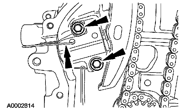 2. Remove the bolts and timing chain tensioner.