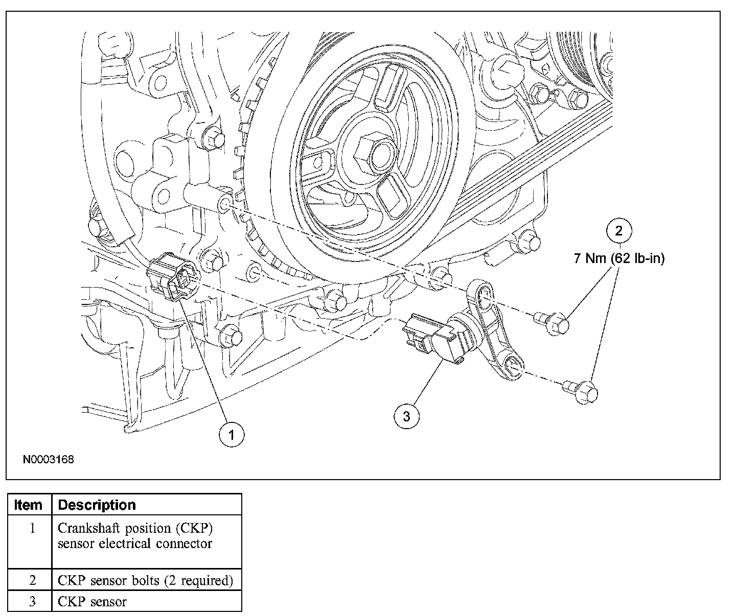 - Tighten the CKP sensor bolts to 7 Nm (62 lb-in).