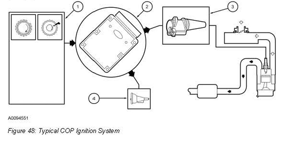 The EI system consists of a crankshaft position (CKP) sensor, coil(s) on plug (COP), and the PCM. The COP integrated EI system uses a separate coil per spark plug, and each coil is mounted directly onto the plug. The COP integrated EI system requires input from the camshaft position (CMP) sensor. Operation of the components are as follows: