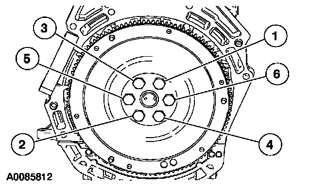 Install the flywheel and tighten the bolts in the sequence shown in 3 stages.