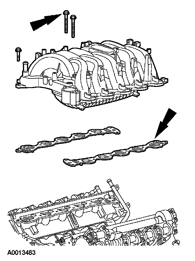 21. Remove the bolts, the upper intake manifold and the intake manifold gaskets. Discard the intake manifold gaskets.