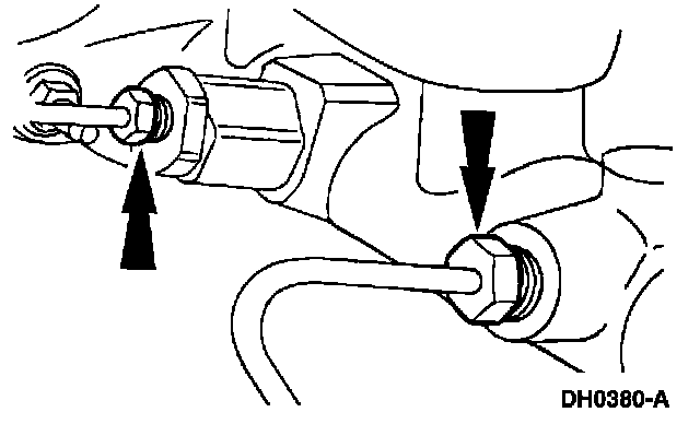 2 Loosen the rear most brake tube fittings until a stream of brake fluid comes out. While the assistant maintains pressure on the brake pedal, tighten the brake tube fitting.