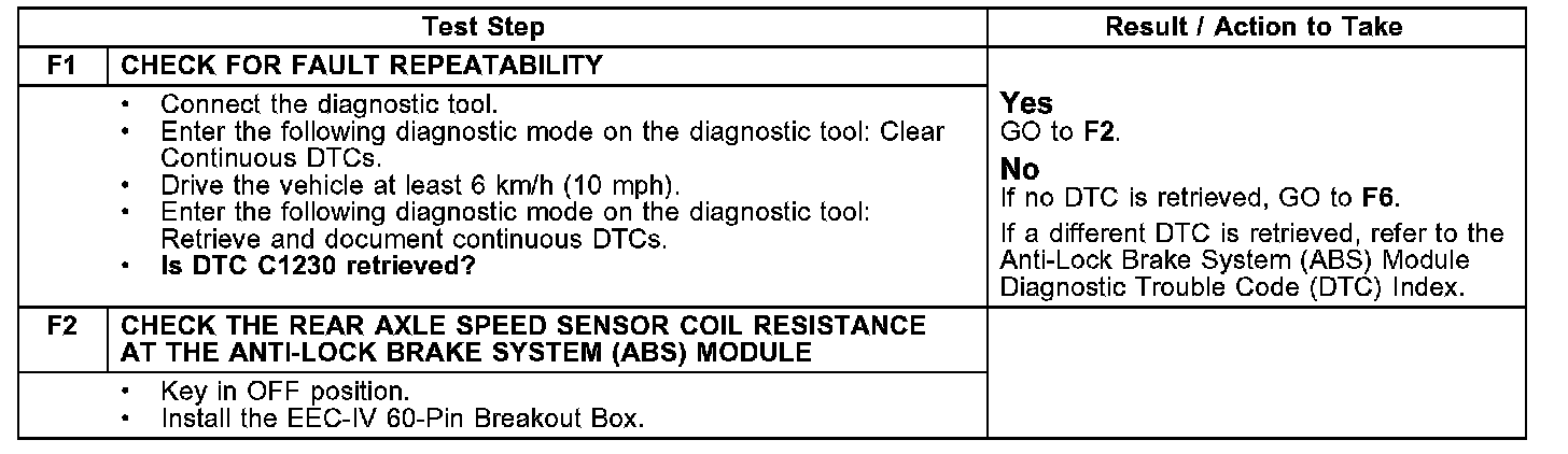 PINPOINT TEST F: DTC C1230-REAR AXLE SPEED SENSOR INPUT CIRCUIT FAILURE