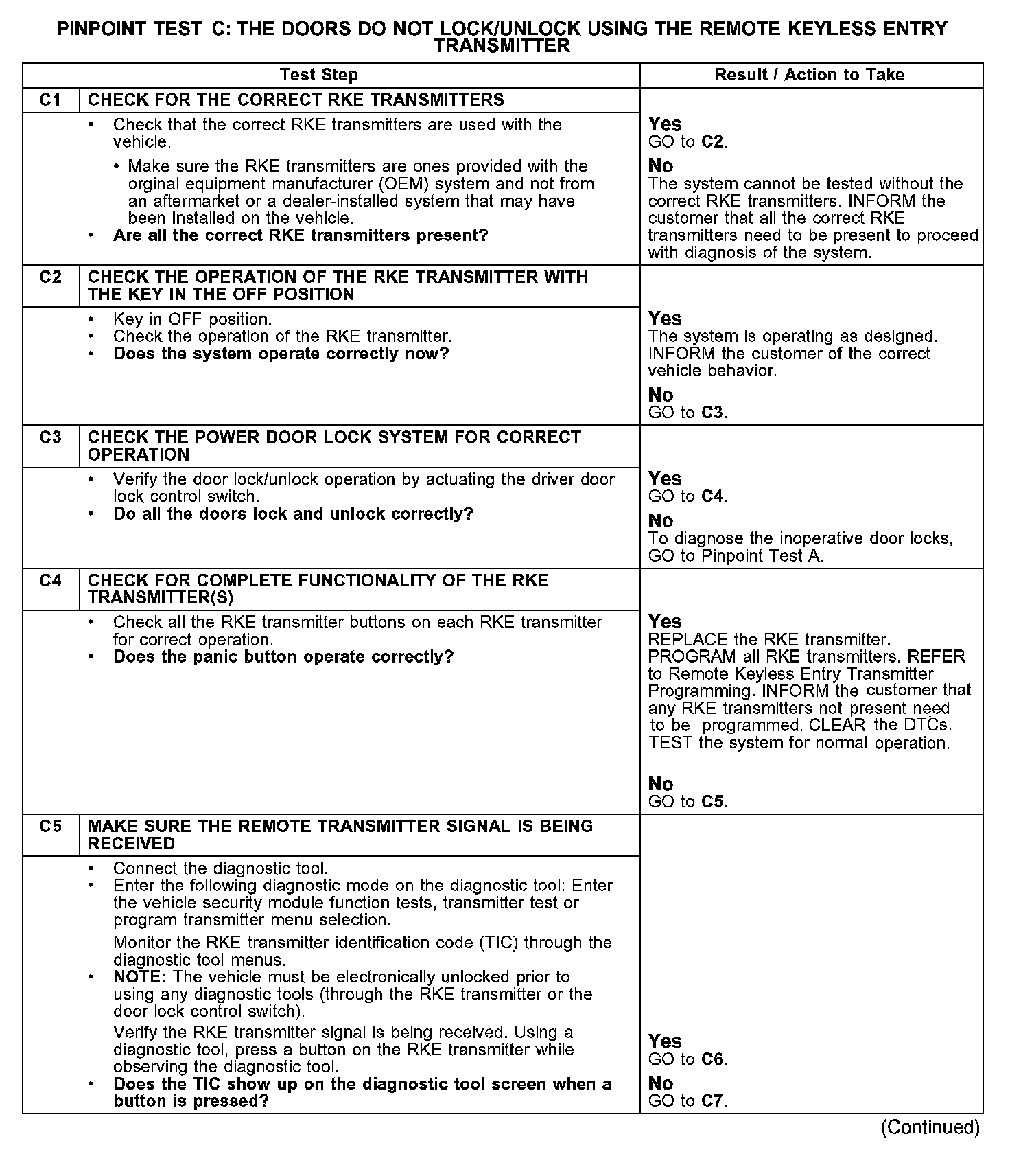PINPOINT TEST C: THE DOORS DO NOT LOCK/UNLOCK USING THE REMOTE KEYLESS ENTRY TRANSMITTERC4-C5: