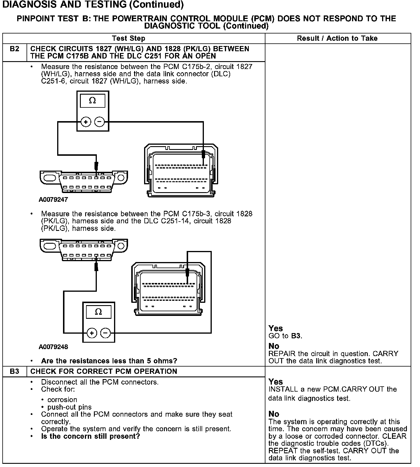 The PCM communicates with the diagnostic tool through controller area network (CAN) circuits 1827 (WH/LG) and 1828 (PK/LG). If one of the CAN circuits become shorted to ground or voltage, or if some but not all termination resistors are lost, communications can continue. Check circuits 1827 (WH/LG) and 1828 (PK/LG) between the PCM C175b and the data link connector (DLC) C251. The total resistance values must not be more than 5 ohms. If the resistance is more than 5 ohms there is an open in circuit 1827 (WH/LG) and 1828 (PK/LG), damage to the DLC C251, damage to the PCM C175b, or a problem with the in-line connector.